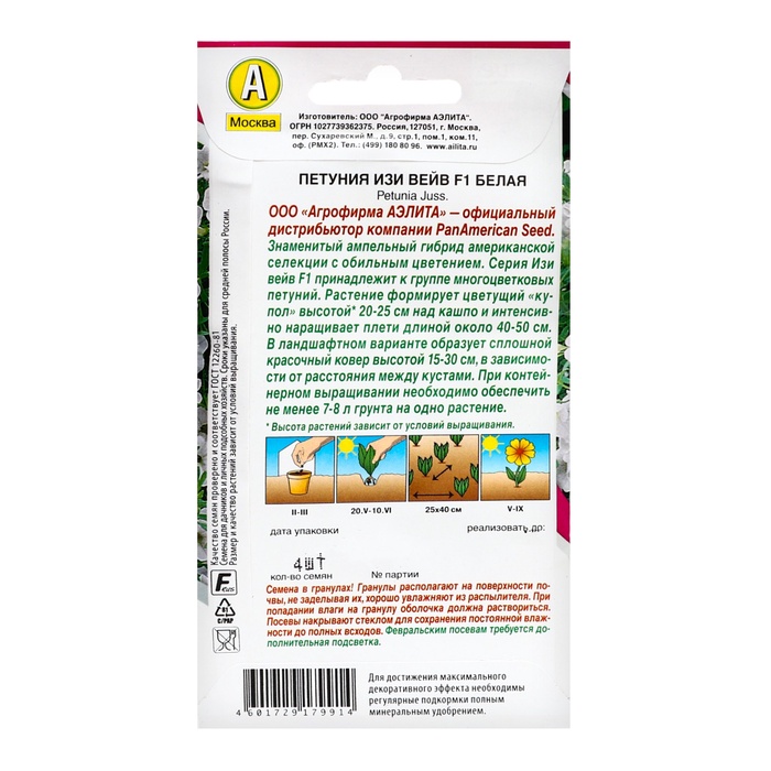 Габариты: 15 x 8 x 0,3 Страна: Коста-Рика В боксе: 100 шт Состав: Семена Материалы: семена Фасовка: по 10 шт Индивидуальная упаковка: Без упаковки Сертификат: Не подлежит сертификации Цвет: Белый Вегетация: Однолетники Вид: Петуния Место выращивания: Подоконник, балкон, Открытый грунт Сухоцвет: Нет Махровые: Нет По форме куста: Кустовая Назначение: Для создания цветников, клумбы Отношение к свету: Светолюбивые Разновидность: Цветущее Нуждаются ли в стратификации: Нет Цветы петунии белой разновидности «Изи Вейв» — идеальный выбор для тех, кто хочет добавить изысканности и свежести в свой сад или интерьер. Эти низкорослые растения идеально подходят как для открытого грунта, так и для выращивания на окнах и балконах. Радующие белыми лепестками на протяжении всего лета, они создадут атмосферу легкости и утонченности, где бы вы их ни разместили. Преимущества