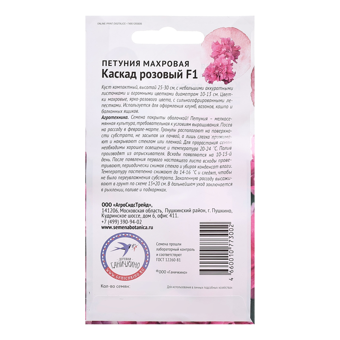 Габариты: 15 x 8 x 0,5 Страна: США В боксе: 100 шт Состав: Семена Материалы: семена Фасовка: по 10 шт Индивидуальная упаковка: Без упаковки Сертификат: Не подлежит сертификации Цвет: Розовый Вегетация: Однолетники Вид: Петуния Посев на рассаду: Февраль, Март Посев (посадка) в грунт: Май, Июнь Место выращивания: Открытый грунт Сухоцвет: Нет Махровые: Нет Высота растений: До 30 см По форме куста: Кустовая Назначение: Для балкона, веранды, Для создания цветников, клумбы Отношение к свету: Светолюбивые Разновидность: Цветущее Нуждаются ли в стратификации: Нет Куст компактный, высотой 25-30 см, с небольшими аккуратными листочками и огромными цветками диаметром 10-13 см. Цветки махровые, синего цвета, с сильно гофрированными лепестками. Используется для оформления клумб, вазонов, кашпо и балконных ящиков. Агротехника: Семена покрыты оболочкой! Петуния – мелкосемянная культура, требовательная к условиям выращивания. Посев на рассаду в феврале-марте. Гранулы располагают на поверхности субстрата, не засыпая их почвой, а лишь слегка прижимают и накрывают стеклом или пленкой. Для прорастания семян необходимо хорошее освещение и температура 20-24˚С. Полив производят из опрыскивателя. Всходы появляются на 10-15 день. После появления первого настоящего листа всходы проветривают, периодически снимая стекло и убирая конденсат влаги. Температуру постепенно снижают до 14-16˚С и следят, чтобы не было переувлажнения субстрата. Закаленную рассаду высаживают в грунт по схеме 15×20 см. В дальнейшем уход заключается в рыхлении, поливе и подкормах. Штрих-код - 4660010772784 Комментарии к товару