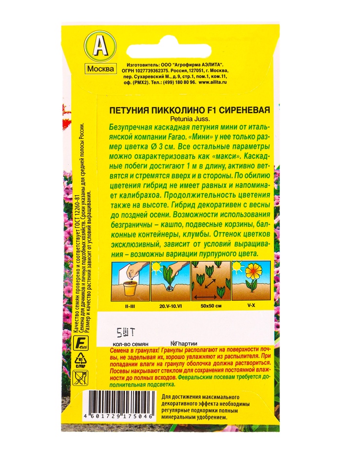 Семена цветов Петуния мини Пикколино F1 сиреневая (драже в пробирке) С. Farao, Ц/П,5 шт.