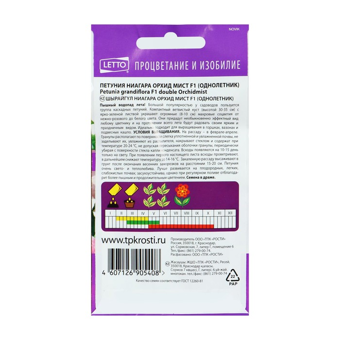 Габариты: 0,3 x 8 x 15 Страна: Россия В боксе: 100 шт Состав: Семена Материалы: семена Фасовка: по 10 шт Индивидуальная упаковка: Без упаковки Сертификат: Не подлежит сертификации Цвет: Розовый Высота, см: 30 - 40 Вегетация: Однолетники Вид: Петуния Посев на рассаду: Март, Февраль, Апрель Посев (посадка) в грунт: Май, Июнь Цветение период: Сентябрь, Август, Июнь, Июль Упаковка: Цветная Место выращивания: Открытый грунт Сухоцвет: Нет Махровые: Нет Высота растений: До 30 см По форме куста: Кустовая Назначение: Для создания цветников, клумбы Отношение к свету: Светолюбивые Разновидность: Цветущее Нуждаются ли в стратификации: Нет Компактный, ветвистый куст (высотой 30-35 см) с ярко-зеленой листвой украшают огромные (8-10 см) махровые соцветия от нежно-розового до белого цвета. Они придадут необыкновенно эффектный вид любому цветнику, и на протяжении всего лета будут радовать своим ярким и праздничным видом. Идеально подходит для выращивания в горшках, вазонах и подвесных кашпо. Особенности выращивания: на рассаду февраль-апрель. Гранулы располагают по поверхности слегка уплотненной и увлажненной почвы, не заделывая их, увлажняют из распылителя, накрывают стеклом и содержат при температуре 20-24°С, не допуская пересыхания оболочки гранулы периодически убирая с поверхности стекла капли конденсата. Всходы появляются на 10-15 день только на свету. При появлении первого настоящего листа всходы проветривают и в дальнейшем снижают температуру до 14-16°С. Закаленную рассаду высаживают в грунт после окончания весенних заморозков на расстоянии 15-20 см. Петуния очень светолюбива и теплолюбива. Лучше развивается на плодородных, легких, слабокислых почвах, засухоустойчива, однако при регулярном поливе отблагодарит более пышным и продолжительным цветением. Комментарии к товару
