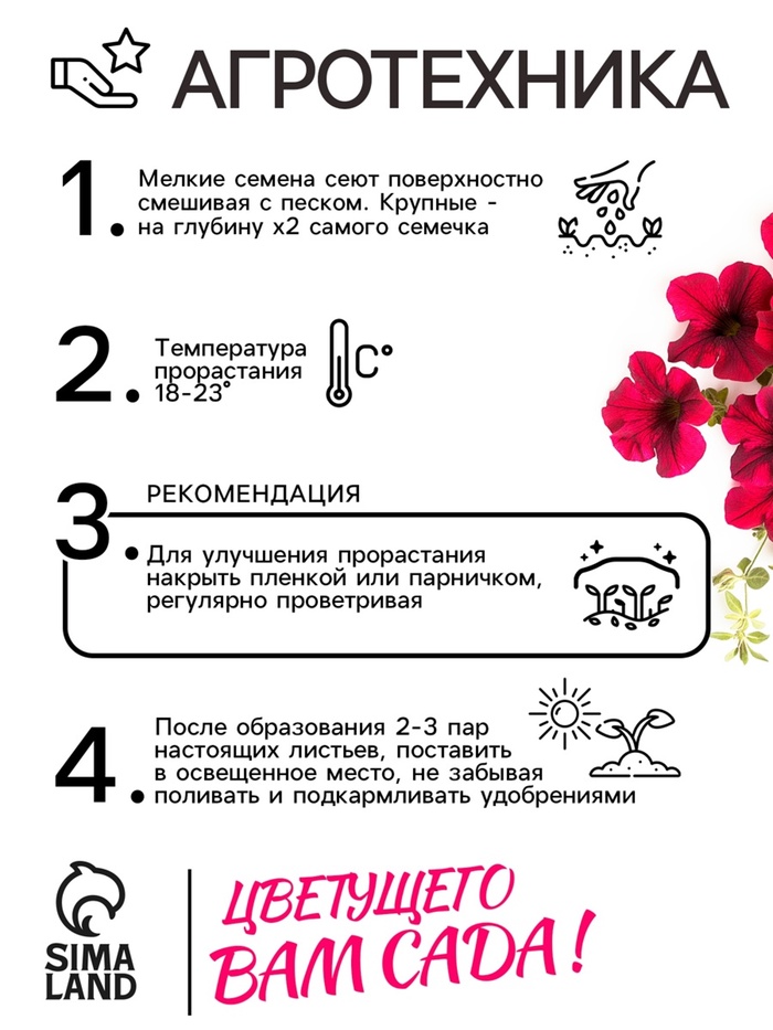 Посев: Рекомендуется сеять семена в феврале-марте. Используйте легкий, хорошо дренированный грунт и обеспечьте достаточное освещение для всходов. Уход: Регулярный полив и удобрение способствуют обильному цветению. Удаляйте увядшие цветы для поддержания декоративного вида и продолжительности цветения. Создайте атмосферу уюта и красоты с петунией "Тайдл Вейв Ред Велюр"! Комментарии к товару