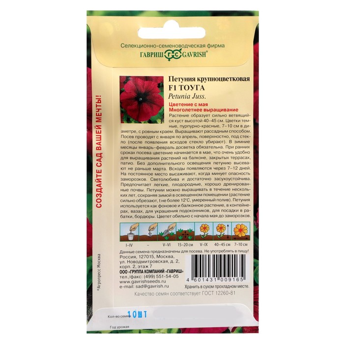 Габариты: 15 x 8 x 0,5 Страна: Россия В боксе: 700 шт Состав: Семена Материалы: семена Фасовка: по 10 шт Индивидуальная упаковка: Без упаковки Сертификат: Не подлежит сертификации Цвет: Бордовый Вегетация: Однолетники Вид: Петуния Место выращивания: Открытый грунт Сухоцвет: Нет Махровые: Нет По форме куста: Кустовая Назначение: Для создания цветников, клумбы, Для балкона, веранды Отношение к свету: Светолюбивые Разновидность: Цветущее Нуждаются ли в стратификации: Нет Фиксированная цена: Да Растение образует сильно ветвящийся куст высотой 40-45 см. Цветки темные, пурпурно-красные, 7-10 см в диаметре, с ровным краем. Выращивают рассадным способом. Посев проводят с января по апрель, поверхностно, под стекло (после появления всходов стекло убирают). В зимние месяцы (январь-февраль) досветка обязательна. При ранних сроках посева цветение начинается в мае, что очень удобно для выращивания растений на балконе, закрытых террасах, патио. Без дополнительного освещения петунию высевают не раньше марта. Всходы появляются через 7-12 дней. На постоянное место высаживают, когда минует опасность заморозков. Светолюбива и достаточно засухоустойчива. Предпочитает легкие, плодородные, хорошо дренированные почвы. Петунии можно выращивать в течение нескольких лет, сохраняя зимой в освещенном помещении (растение сильно обрезают, t не более 12°C, умеренный полив). Петуния используется как фоновое и балконное растение, в контейнерах, вазах, для украшения подоконников, для посадки в рабатки, бордюры. Цветет обильно с начала мая до заморозков. Комментарии к товару