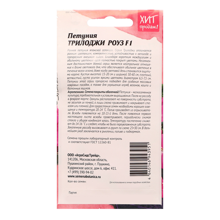 Габариты: 15 x 8 x 0,5 Страна: Индонезия В боксе: 200 шт Состав: Семена Материалы: семена Фасовка: по 10 шт Индивидуальная упаковка: Без упаковки Сертификат: Не подлежит сертификации Цвет: Розовый Вегетация: Однолетники Вид: Петуния Посев на рассаду: Март, Февраль Посев (посадка) в грунт: Май Цветение период: Сентябрь, Июль, Август, Июнь Место выращивания: Открытый грунт Сухоцвет: Нет Махровые: Нет Высота растений: До 30 см По форме куста: Кустовая Назначение: Для балкона, веранды Отношение к свету: Светолюбивые Разновидность: Цветущее Нуждаются ли в стратификации: Нет Ранняя петуния японской селекции. Серия Трилоджи отличается ранним цветением, компактностью, устойчивостью к непогоде и прекрасным внешним видом. Благодаря коротким междоузлиям и обильному цветению куст полностью покрыт цветами._x005F_x000B_Несомненным достоинством данной серии является нейтральное отношение к длине светового дня, что обеспечивает обильное цветение в течение всего сезона, даже когда световой день становится ощутимо короче. Кустик высотой 15-20 см и шириной 50-60 см, плотный, ветвистый, густо усыпан яркими цветками, диаметром 6,5 – 7,5 см. Эффектная смесь состоит из двух расцветок, прекрасно сочетающихся друг с другом, насыщенно голубо-синей и снежно белой. Петунии этой серии прекрасно подходят для создания массовых ковровых посадок, а также для украшения клумб, вазонов, кашпо и балконных ящиков. Агротехника: Семена покрыты оболочкой! Петуния – мелкосемянная культура, требовательная к условиям выращивания. Посев на рассаду в феврале-марте. Гранулы располагают на поверхности субстрата, не засыпая их почвой, а лишь слегка прижимают и накрывают стеклом или пленкой. Для прорастания семян необходимо хорошее освещение и температура 20-24˚С. Полив производят из опрыскивателя. Всходы появляются на 10-15 день. После появления первого настоящего листа всходы проветривают, периодически снимая стекло и убирая конденсат влаги. Температуру постепенно снижают до 14-16˚С и следят, чтобы не было переувлажнения субстрата. Закаленную рассаду высаживают в грунт по схеме 15×20 см. В дальнейшем уход заключается в рыхлении, поливе и подкормах. Штрих-код - Комментарии к товару