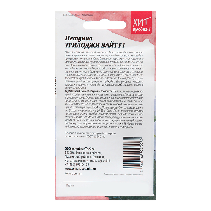Производитель: Агросидстрейд Габариты: 15 x 8 x 0,5 Страна: Индонезия В боксе: 100 шт Состав: Семена Материалы: семена Фасовка: по 10 шт Индивидуальная упаковка: Без упаковки Сертификат: Не подлежит сертификации Цвет: Белый Вегетация: Однолетники Вид: Петуния Посев на рассаду: Март, Февраль Посев (посадка) в грунт: Май Цветение период: Август, Июль, Сентябрь, Июнь Место выращивания: Открытый грунт Сорт: F1 Сухоцвет: Да Махровые: Да Высота растений: До 30 см По форме куста: Кустовая Назначение: Для балкона, веранды, Для создания цветников, клумбы Отношение к свету: Светолюбивые Разновидность: Цветущее Нуждаются ли в стратификации: Нет