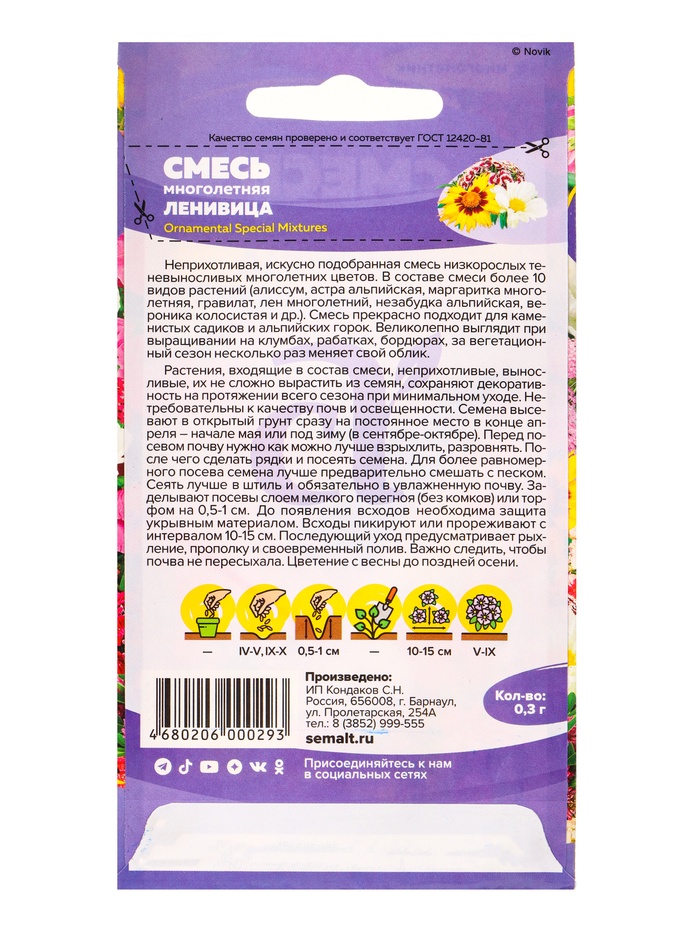 Габариты: 15 x 8 x 0,1 Страна: Россия В боксе: 800 шт Состав: См. на упаковке Материалы: см. на упаковке Фасовка: по 10 шт Индивидуальная упаковка: Без упаковки Сертификат: Не подлежит сертификации Цвет: МИКС Вегетация: Многолетники Вид: Прочие Посев на рассаду: Апрель, Февраль, Март Посев (посадка) в грунт: Май Цветение период: Июль, Сентябрь, Август, Июнь Место выращивания: Открытый грунт Сухоцвет: Нет Махровые: Нет По форме куста: Кустовая Назначение: Для создания цветников, клумбы Отношение к свету: Светолюбивые Разновидность: Цветущее Нуждаются ли в стратификации: Нет Неприхотливая, искусно подобранная смесь низкорослых теневыносливых многолетних цветов. В составе смеси более 10 видов растений (алиссум, астра альпийская, маргаритка многолетняя, гравилат, лен многолетний, незабудка альпийская, вероника колосистая и др.), которые будут радовать вас ярким и пышным цветением с ранней весны до поздней осени. Смесь прекрасно подходит для каменистых садиков и альпийских горок. Великолепно выглядит при выращивании на клумбах, рабатках, бордюрах, за вегетационный сезон несколько раз меняет свой облик. Растения, входящие в состав смеси, неприхотливые, выносливые, их не сложно вырастить из семян, сохраняют декоративность на протяжении всего сезона при минимальном уходе. Нетребовательны к качеству почв и освещенности. Семена высевают в открытый грунт сразу на постоянное место в конце апреля – начале мая или под зиму (в сентябре-октябре). Перед посевом почву нужно как можно лучше взрыхлить, разровнять. После чего сделать рядки и посеять семена. Для более равномерного посева семена лучше предварительно смешать с песком. Сеять лучше в штиль, и обязательно в увлажненную почву. Заделывают посевы слоем мелкого перегноя (без комков) или торфом на 0,5-1 см. До появления восходов необходима защита укрывным материалом. Всходы пикируют или прореживают с интервалом 10-15 см. Последующий уход предусматривает рыхление, прополку и своевременный полив. Важно следить, чтобы почва не пересыхала. Комментарии к товару