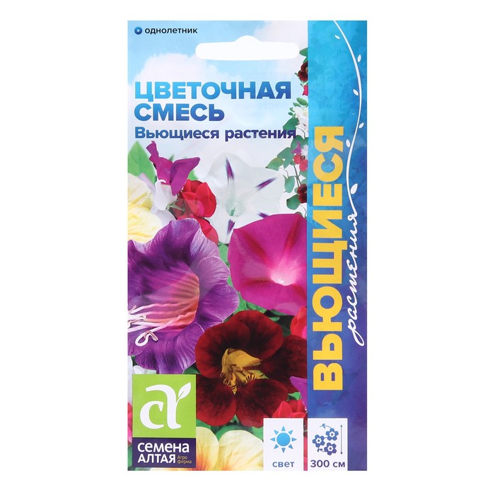 Смесь составлена из наиболее декоративных, популярных и неприхотливых однолетних вьющихся растений – настурций, душистых горошков, вьюнка, ипомеи, и пр. Отличается энергичным ростом и продолжительным цветением. Смесь используется для декорирования построек и изгородей, оплетения беседок и арок, создания в саду «зелёного объёма».