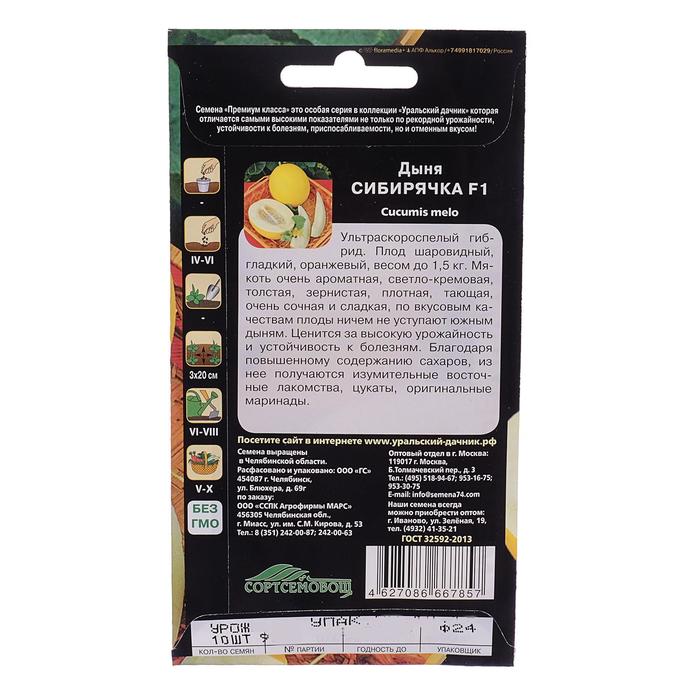Ультраскороспелый гибрид. Плод шаровидный, гладкий, оранжевый, весом до 1,5 кг. Мякоть очень ароматная, светло-кремовая, толстая, зернистая, плотная, тающая, очень сочная и сладкая, по вкусовым качествам плоды ничем не уступают южным дыням. Гибрид устойчив к пониженным температурам и другим неблагоприятным условиям. Ценится за высокую урожайность и устойчивость к болезням. Благодаря повышенному содержанию сахаров, из нее получаются изумительные восточные лакомства, цукаты, оригинальные маринады.