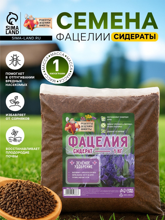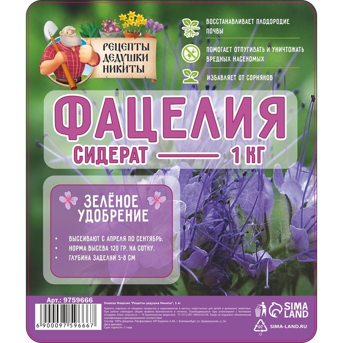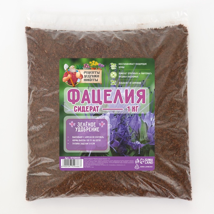 Габариты: 22 x 22 x 4 Страна: Россия В боксе: 1 шт Состав: См. на упаковке Материалы: см. на упаковке Фасовка: по 1 шт Индивидуальная упаковка: Пакет Сертификат: Не подлежит сертификации Посев (посадка) в грунт: Август, Сентябрь, Июнь, Май Место выращивания: Открытый грунт Состав газонных трав: Фацелия Вес/Объём: 1 кг Универсальный вариант для огорода в любом регионе, этот сидерат улучшает почву по ряду показателей, а культивировать его очень просто.Виды применения:1) Медонос. Сбор меда с гектара посадки составляет 200 кг, на плодородных почвах – 300 кг. Даже несколько кустиков привлекут достаточно много насекомых-опылителей на участок.2) Корм скоту и птице. Польза фацелии в рационе животных в первую очередь связана с ее бактерицидными свойствами. Кроме того, это питательная зелень, которая не содержит никаких вредных веществ.3) Инсектицид. Растение отпугивает многих вредителей – нематод, тлей, проволочников, долгоносиков, саранчу и зерновку гороховую. А также приманивает хищных насекомых, питающихся цветоедами, листовертками, плодожорками.4) Фунгицид. На корнях фацелий живут бактерии, продуцирующие природные антибиотики. Поэтому овощи, растущие на участке после сидерата, не подвержены фитофторозу, гнилям и другим грибковым болезням. Преимущество фацелии в том, что она не состоит в родстве с овощными, злаковыми, ягодными, плодовыми культурами и не страдает ни одной огородной болезнью. Поэтому сеять сидерат можно после любых растений.Особенности: фацелия отличается редкой неприхотливостью.Морозостойкость: сидерат выдерживает похолодание до - 9°C, даже для молодых всходов безопасны заморозки до - 5°C.Засухоустойчивость: культура засухоустойчива, хорошо растет не только в залитых солнцем местах, но и в тени.Норма высева: 200 г семян на 100 кв. м. (на сотку). Комментарии к товару