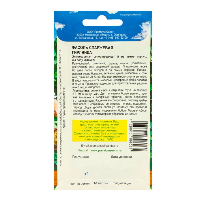 Габариты: 15 x 8 x 0,1 Страна: Россия В боксе: 600 шт Состав: Семена Материалы: семена Фасовка: по 10 шт Индивидуальная упаковка: Без упаковки Сертификат: Не подлежит сертификации Сроки созревания: Средний Место выращивания: Открытый грунт Сорт: Гирлянда Раннеспелый, сахарный, фантастически урожайный, диетический сорт спаржевой фасоли. Плодоносит через 50-65 дней после всходов и до самых морозов. Плоды-лопатки очень большие, зелёного цвета, мясистые и сочные, длинной 20-33см, без пергаментного слоя и волокон. В пищу используются молодые недозрелые бобы-лопатки и семена. Прекрасно подходит для приготовления различных блюд и заморозки. АГРОТЕХНИКА: Семена сеют в открытый грунт на глубину 2-3 см в конце мая. Для получения более раннего урожая высевают в торфяные горшочки, затем переносят в открытый грунт. Растения высокорослые, поэтому требуется опора. Необходимы регулярные поливы, подкормки. Период сбора урожая растянут, поэтому его проводят многократно по мере созревания бобов. Частые сборы молодых лопаток стимулируют образование новых. Комментарии к товару