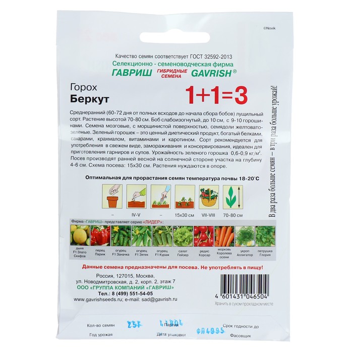 Габариты: 16 x 11 x 0,5 Страна: Россия В боксе: 200 шт Состав: Семена Материалы: семена Фасовка: по 5 шт Индивидуальная упаковка: Без упаковки Сертификат: Не подлежит сертификации Сроки созревания: Средний Посев (посадка) в грунт: Апрель, Май Упаковка: Цветная Место выращивания: Открытый грунт Сорт: Беркут Высота растений: 60-100 см Среднеранний (60-72 дня от полных всходов до начала сбора бобов) лущильный сорт. Растения высотой 70-80 см. Боб слабоизогнутый до 10 см, с 9-10 горошинами. Семена мозговые с морщинистой поверхностью, семядоли желтовато-зеленые. Зеленый горошек - это ценный диетический продукт богатый белками, сахарами, крахмалом, витаминами и каротином. Сорт рекомендуется для употребления в свежем виде, замораживания и консервирования, идеален для приготовления гарниров и супов. Урожайность зеленого горошка 0,6 - 0,9 кг/м2. Посев производят ранней весной на солнечной стороне участка на глубину 4-6 см. Схема посева: 15x30 см. Растения нуждаются в опоре. Комментарии к товару