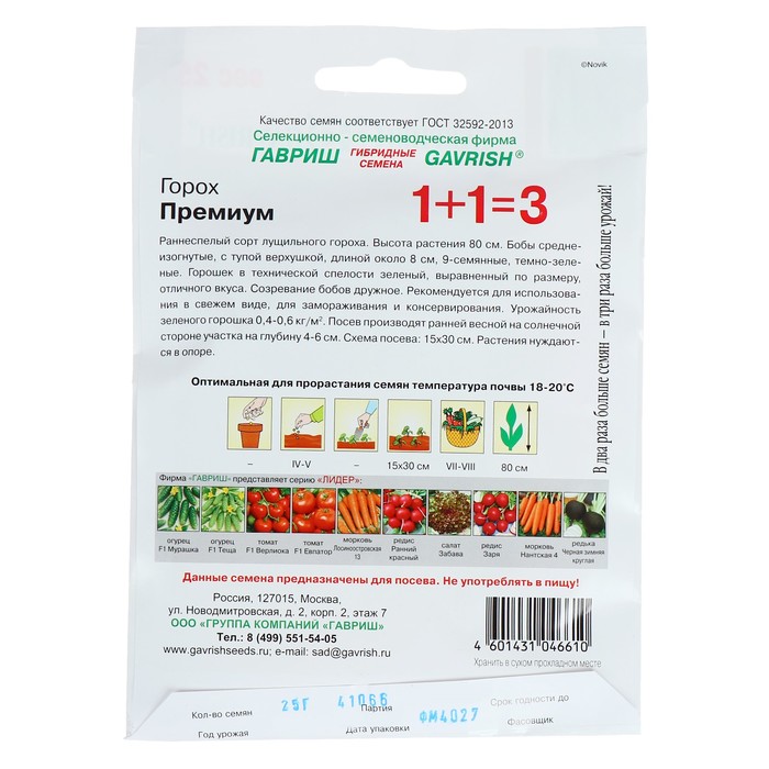 Раннеспелый сорт лущильного гороха. Высота растения 80 см. Бобы среднеизогнутые, с тупой верхушкой, длиной около 8 см, 9-семянные, темно-зеленые. Горошек в технической спелости зеленый, выравненный по размеру, отличного вкуса. Созревание бобов дружное. Рекомендуется для использования в свежем виде, для замораживания и консервирования. Урожайность зеленого горошка 0,4-0,6 кг/м2. Посев производят ранней весной на солнечной стороне участка на глубину 4-6 см. Схема посева: 15x30 см. Растения нуждаются в опоре.