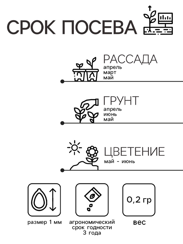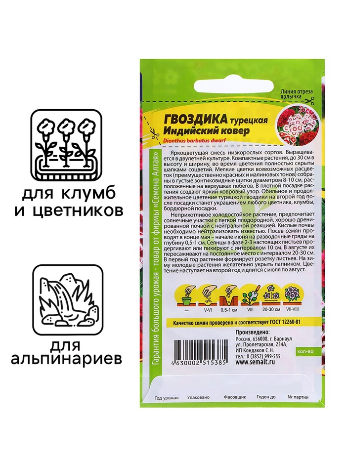 Габариты: 15 x 8 x 0,1 Страна: Россия В боксе: 500 шт Состав: См. на упаковке Материалы: см. на упаковке Фасовка: по 10 шт Сертификат: Не подлежит сертификации Цвет: МИКС Вегетация: Многолетники Вид: Гвоздика Место выращивания: Открытый грунт Сухоцвет: Да Махровые: Да По форме куста: Кустовая Назначение: Для создания цветников, клумбы Отношение к свету: Светолюбивые Разновидность: Цветущее Нуждаются ли в стратификации: Нет Фиксированная цена: Да Большие красочные цветы с приятным ароматом на невысоких стеблях. Идеально подходят для клумб и садовых вазонов.Как выращивать посев в открытый грунт. Когда: С апреля по июль.Где: В открытом грунте. Как: Сейте редко с интервалом 20 см, присыпьте грунтом. Регулярно поливайте. Всходыпоявляются на 14-28 день. Уход: Когда всходы станут большими, при необходимости рассадите их. Регулярнополивайте и пропалывайте. Цветение: С мая по июль на второй год после посева. Комментарии к товару