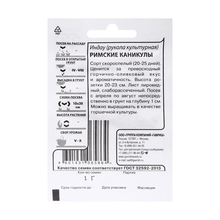 Габариты: 11,5 x 7,5 x 0,1 Страна: Россия В боксе: 800 шт Состав: См. на упаковке Материалы: см. на упаковке Фасовка: по 10 шт Индивидуальная упаковка: Без упаковки Сертификат: Не подлежит сертификации Сроки созревания: Средний Посев (посадка) в грунт: Апрель, Май, Июнь Место выращивания: Универсальный Вид: Семечки Применение: Душистые (на зелень, в салаты, в блюда) Можно выращивать на подоконнике: Да Эта приятная во всех отношениях зеленная культура стала популярна благодаря итальянской кухне. И действительно рукола обладает очень интересным многогранным вкусом. Тут и яркие горчичные нотки, и легкое послевкусие свежих оливок. Прекрасно сочетается с любыми свежими овощами, мясом, морепродуктами, дополняет сэндвичи и бутерброды. Руколу можно сажать очень рано, даже в комнатных условиях на окне она чувствует себя прекрасно и быстро (через 20-25 дней после всходов) дает полноценный урожай зелени. Посев семян производят регулярно с начала сезона по август непосредственно в грунт, на глубину 1 см. Растение неприхотливо. Предназначено для выращивания в открытом грунте, под пленочными укрытиями, в качестве горшечной культуры на подоконнике. Урожайность 1,0-1,3 кг/м2. Комментарии к товару