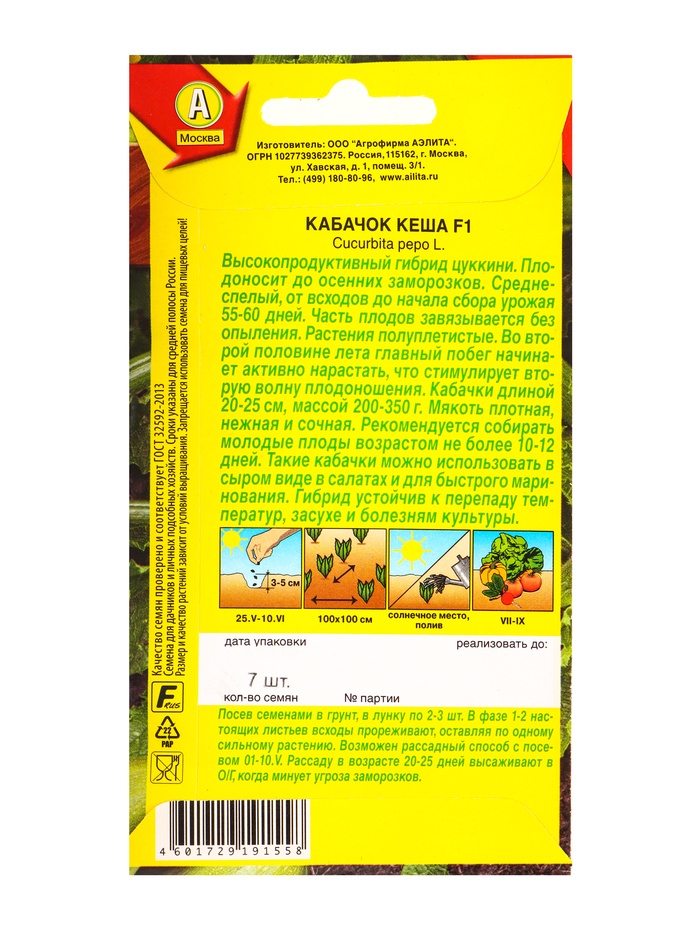 Производитель: Агрофирма АЭЛИТА Габариты: 15 x 8 x 0,2 Страна: Россия В боксе: 300 шт Состав: См. на упаковке Материалы: см. на упаковке Фасовка: по 10 шт Сертификат: Не подлежит сертификации Сроки созревания: Ранний Посев на рассаду: Апрель Посев (посадка) в грунт: Май Место выращивания: Открытый грунт Сорт или гибрид: Гибрид F1 Цвет плода: Зелёный Форма: Цилиндрическая