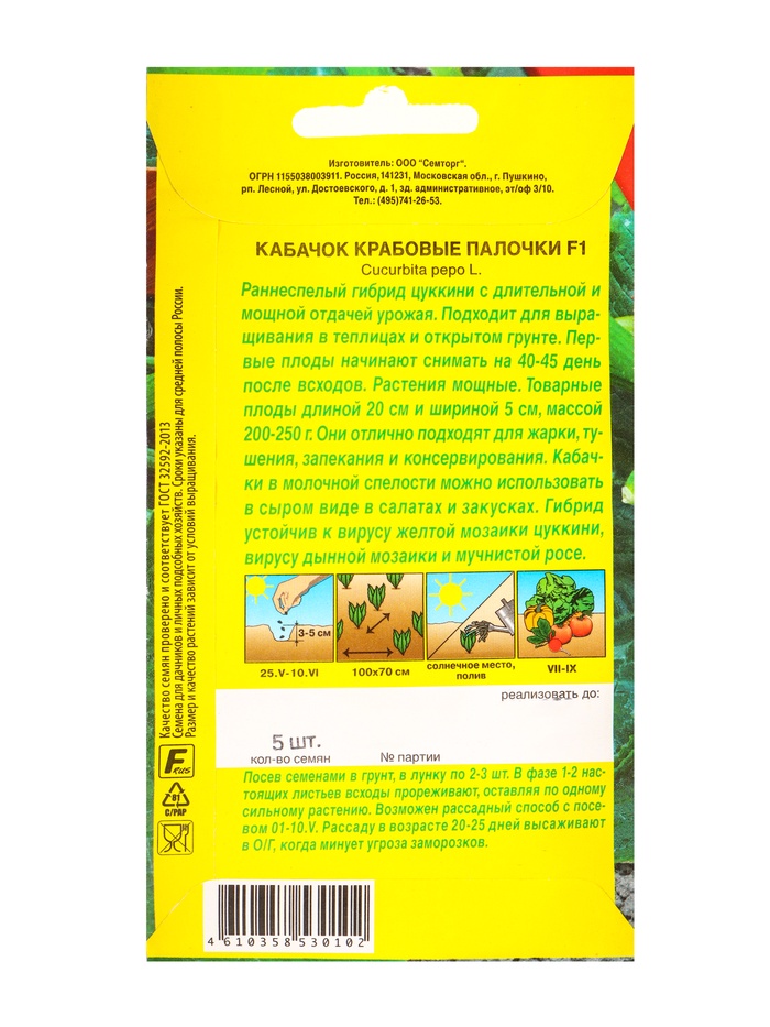 Габариты: 15 x 8 x 0,2 Страна: Россия В боксе: 200 шт Состав: См. на упаковке Материалы: см. на упаковке Фасовка: по 10 шт Сертификат: Не подлежит сертификации Сроки созревания: Ранний Посев на рассаду: Апрель Посев (посадка) в грунт: Май Место выращивания: Открытый грунт Сорт или гибрид: Гибрид F1 Цвет плода: Зелёный, Жёлтый Форма: Цилиндрическая Комментарии к товару