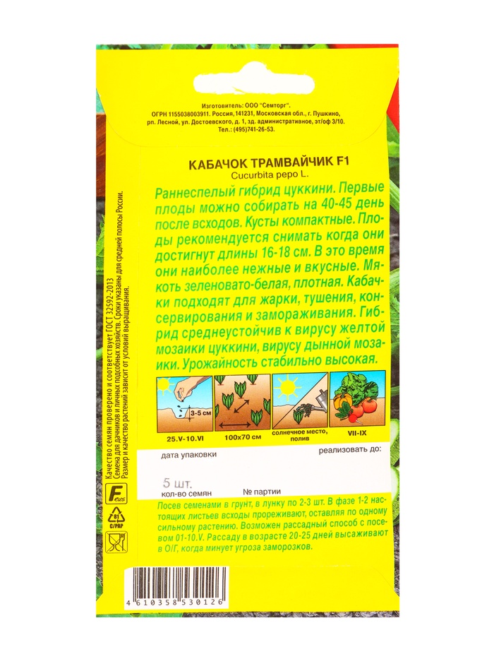 Габариты: 15 x 8 x 0,2 Страна: Россия В боксе: 200 шт Состав: См. на упаковке Материалы: см. на упаковке Фасовка: по 10 шт Сертификат: Не подлежит сертификации Сроки созревания: Ранний Посев на рассаду: Апрель Посев (посадка) в грунт: Май Место выращивания: Открытый грунт Сорт или гибрид: Гибрид F1 Цвет плода: Зелёный Форма: Цилиндрическая Комментарии к товару