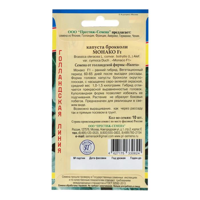 Монако F1 - гибрид капусты брокколи средней спелости, с вегетационным периодом 70 - 80 дней от высадки рассады. Компактное растение с сильной корневой системой. Кочаны куполовидной формы, без боковых побегов, весом около 1,5-2 килограмма. Возможно выращивание в любых условиях. Стабильный урожай в любых условиях. У этого гибрида мощный иммунитет к фузариозу, а так же толерантность к бактериозу. Для сбора осенью. Используется для заморозки, употребления в свежем виде. Высокое качество среди гибридов для замораживания.