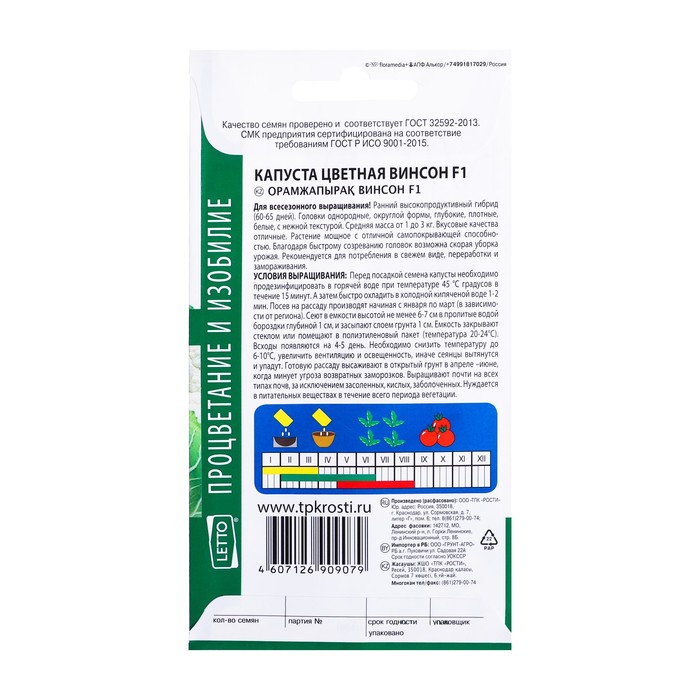 Для всесезонного выращивания. Ранний высокопродуктивный гибрид 60-65 дней. Головки однородные, округлой формы, глубокие, плотные, белые, с нежной текстурой. Средняя масса от 1 до 3 кг. Вкусовые качества отличные. Растение мощное с отличной самопокрывающей способностью. Благодаря быстрому созреванию головок возможна скорая уборка урожая. Рекомендуется для потребления в свежем виде, переработки и замораживания. УСЛОВИЯ ВЫРАЩИВАНИЯ: перед посадкой семена капусты необходимо продезинфицировать в горячей воде при температуре 45 °С градусов в течение 15 минут. А затем быстро охладить в холодной кипяченой воде 1-2 мин. Посев на рассаду производят начиная с января по март (в зависимости от региона). Сеют в емкости высотой не менее 6-7 см в пролитые водой бороздки глубиной 1 см, и засыпают слоем грунта 1 см. Емкость закрывают стеклом или помещают в полиэтиленовый пакет (температура 20-24°С). Всходы появляются на 4-5 день. Необходимо снизить температуру до 6-10°С, увеличить вентиляцию и освещенность, иначе сеянцы вытянутся и упадут. Готовую рассаду высаживают в открытый грунт в апреле–июне, когда минует угроза возвратных заморозков. Выращивают почти на всех типах почв, за исключением засоленных, кислых, заболоченных. Нуждается в питательных веществах в течение всего периода вегетации.