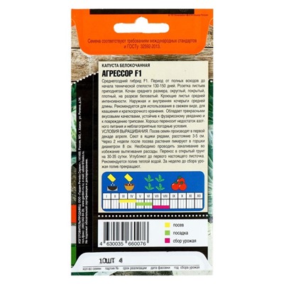 Габариты: 15 x 8 x 0,2 Страна: Россия В боксе: 3100 шт Состав: Семена Материалы: семена Фасовка: по 10 шт Индивидуальная упаковка: Без упаковки Сертификат: РСТ Сроки созревания: Средний Посев на рассаду: Март, Апрель Посев (посадка) в грунт: Май, Июнь Упаковка: Цветная Место выращивания: Открытый грунт Сорт или гибрид: Гибрид F1 Вегетационный период, дни: 117 Вид капусты: Белокачанная Вид: Горошины Применение: Универсальное Среднепоздний (115–125 дней от всходов до технической спелости) гибрид. Розетка листьев приподнятая. Лист среднего размера, округлый, серо-зеленый с восковым налетом, по краю слабоволнистый. Кочан плоскоокруглый, высокой плотности, массой 3-5 кг. Отличается стабильной урожайностью, устойчивостью к фузариозному увяданию, имеет высокие товарные и вкусовые качества, хорошо переносит недостаток азотного питания, не растрескивается. Рекомендован для использования в свежем виде, для квашения и хранения до 5 месяцев. Урожайность 8 кг/кв.м. Комментарии к товару