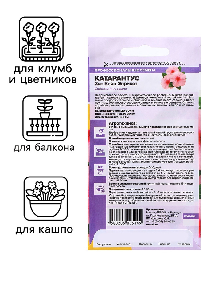 Габариты: 15 x 8 x 0,1 Страна: Россия В боксе: 1000 шт Состав: См. на упаковке Материалы: см. на упаковке Фасовка: по 10 шт Сертификат: Не подлежит сертификации Цвет: Розовый Высота, см: 20 - 30 Вегетация: Однолетники Вид: Катарантус Место выращивания: Универсальный Подходит для балкона: Да Сухоцвет: Нет Махровые: Да По форме куста: Кустовая Назначение: Для создания цветников, клумбы, Для балкона, веранды Отношение к свету: Рассеянный свет Разновидность: Цветущее Нуждаются ли в стратификации: Нет Неприхотливое засухо- и жароустойчивое растение. Быстро разрастается и хорошо ветвится, формируя компактный густой кустик. Цветение продолжительное и обильное в течение всего сезона. Цветки крупные, абрикосово-розового цвета с малиновым центром. Отлично подойдет для выращивания в балконных ящиках, кашпо и на клумбах. Высота растения: 20-30 см, ширина растения: 20-30 см, диаметр цветка: 3-5 см. Комментарии к товару