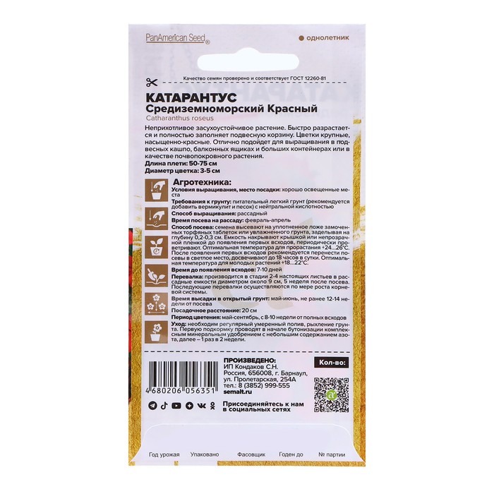Габариты: 15 x 8 x 0,1 Страна: Россия В боксе: 100 шт Состав: См. на упаковке Материалы: см. на упаковке Фасовка: по 10 шт Сертификат: Не подлежит сертификации Цвет: Красный Высота, см: 20 - 30 Вегетация: Однолетники Вид: Катарантус Место выращивания: Универсальный Сухоцвет: Нет Махровые: Нет По форме куста: Ампельная Назначение: Для балкона, веранды Отношение к свету: Рассеянный свет Разновидность: Цветущее Неприхотливое засухоустойчивое растение. Быстро разрастается и полностью заполняет подвесную корзину. Цветки крупные, насыщенно-красные. Отлично подойдет для выращивания в подвесных кашпо, балконных ящиках и больших контейнерах или в качестве почвопокровного растения. Комментарии к товару