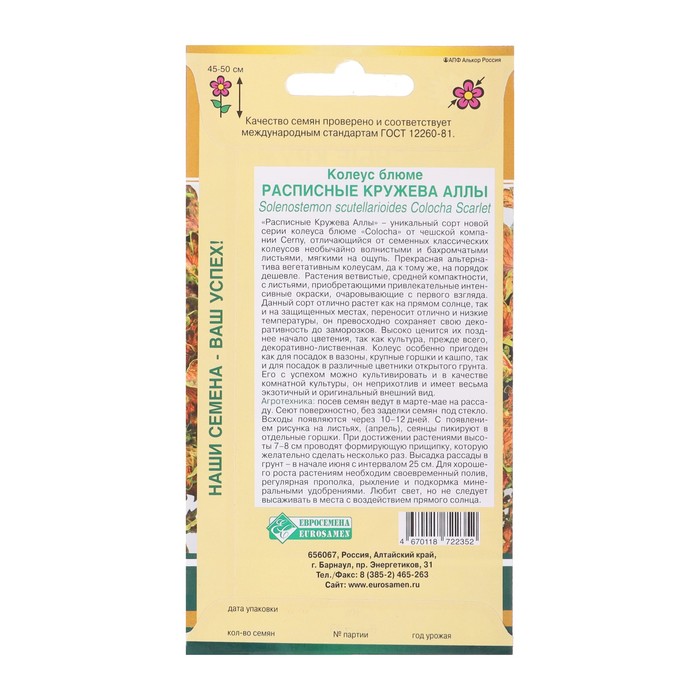 Габариты: 15 x 8 x 0,2 Страна: Россия В боксе: 400 шт Состав: См. на упаковке Материалы: см. на упаковке Фасовка: по 10 шт Индивидуальная упаковка: Без упаковки Сертификат: Не подлежит сертификации Цвет: Оранжевый Вегетация: Многолетники Вид: Колеус Место выращивания: Открытый грунт, Подоконник, балкон Сухоцвет: Нет Махровые: Нет По форме куста: Кустовая, Ампельная Назначение: Для балкона, веранды Отношение к свету: Рассеянный свет Разновидность: Декоративно-лиственные Комментарии к товару