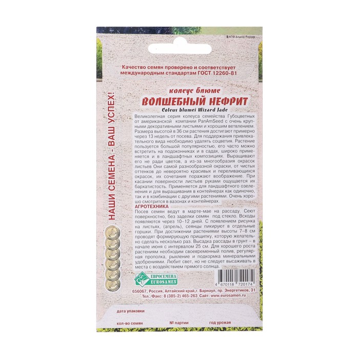 Габариты: 15 x 8 x 0,1 Страна: Россия В боксе: 500 шт Состав: См. на упаковке Материалы: см. на упаковке Фасовка: по 10 шт Индивидуальная упаковка: Без упаковки Сертификат: Не подлежит сертификации Цвет: Зелёный Вегетация: Многолетники Вид: Колеус Место выращивания: Универсальный Подходит для балкона: Нет Сухоцвет: Да Махровые: Нет По форме куста: Ампельная, Кустовая Назначение: Для балкона, веранды Отношение к свету: Рассеянный свет Разновидность: Декоративно-лиственные Нуждаются ли в стратификации: Нет Наша коллекция семян включает как популярные овощи, так и яркие цветы, идеально подходящие для вашего сада. С нами вы сможете наслаждаться богатым урожаем и великолепием цветения в любое время года. Данные семена идеально подойдут для выращивания в вашем саду. Комментарии к товару
