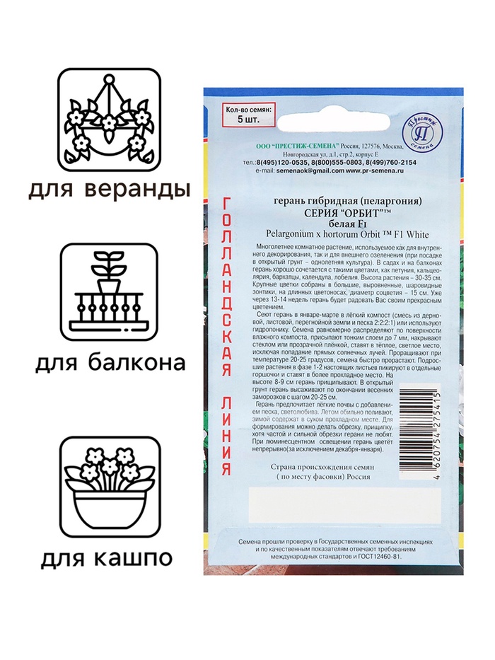Габариты: 15 x 8 x 0,1 Страна: Россия В боксе: 200 шт Состав: Семена Материалы: семена Фасовка: по 10 шт Индивидуальная упаковка: Без упаковки Сертификат: Не подлежит сертификации Цвет: Белый Высота, см: 30 - 35 Вегетация: Многолетники Вид: Прочие Тип: Комнатные Цветение период: Октябрь, Август, Ноябрь, Сентябрь, Апрель, Июнь, Июль, Май Упаковка: Цветная Место выращивания: Универсальный Подходит для балкона: Нет Махровые: Нет Высота растений: До 30 см По форме куста: Кустовая Отношение к свету: Рассеянный свет Многолетнее комнатное растение, используемое как для внутреннего декорирования, так и для внешнего озеленения (при посадке в открытый грунт - однолетняя культура). В садах и на балконах герань хорошо сочетается с такими цветами, как петуния, кальцеолярия, бархатцы, календула, лобелия. Высота растения – 30-35 см. Крупные цветки собраны в большие, выровненные, шаровидные зонтики, на длинных цветоносах, диаметр соцветия – 15 см. Комментарии к товару