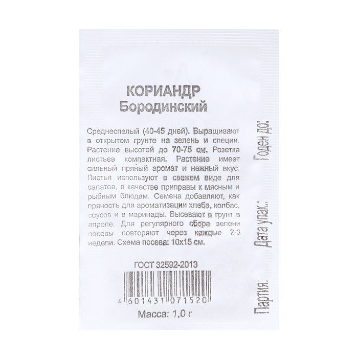 Габариты: 11,5 x 7,5 x 0,1 Страна: Россия В боксе: 300 шт Состав: См. на упаковке Материалы: см. на упаковке Фасовка: по 20 шт Индивидуальная упаковка: Без упаковки Сертификат: Не подлежит сертификации Сроки созревания: Средний Место выращивания: Универсальный Среднеспелый (40–45 дней). Выращивают в открытом грунте на зелень и специи. Розетка листьев компактная, высотой 70–75 см, состоит из зубчатых листьев. Растение имеет сильный пряный аромат и нежный вкус. Высевают в грунт в апреле. Для регулярного сбора зелени посевы повторяют через каждые 2–3 недели. Схема посева: 10х20 см. Урожайность до 2,5 кг/кв.м. Комментарии к товару