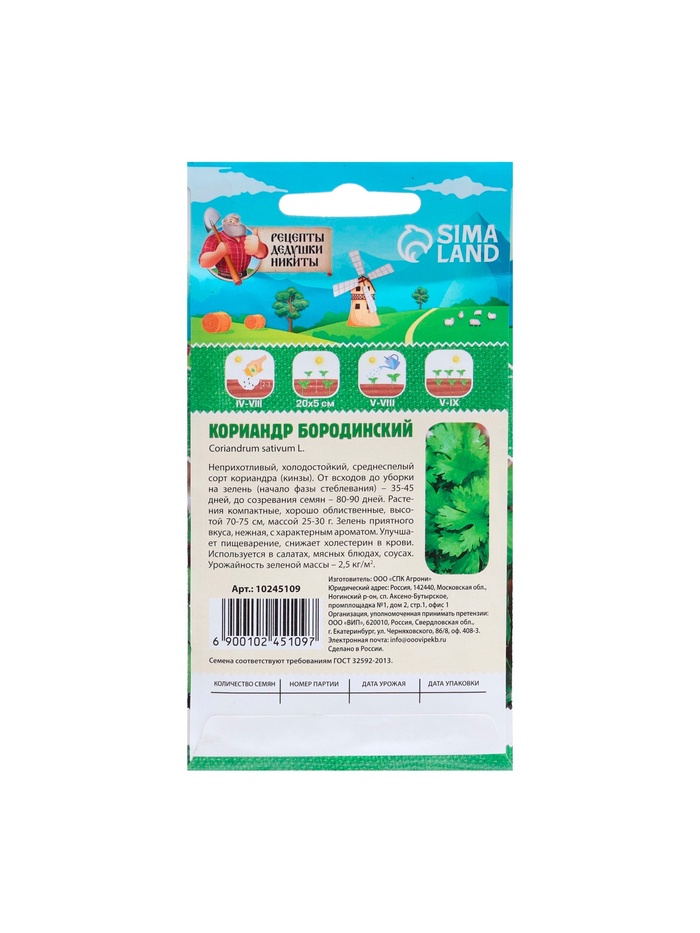Габариты: 15 x 8 x 0,1 Страна: Россия В боксе: 560 шт Состав: Семена Материалы: семена Фасовка: по 10 шт Индивидуальная упаковка: Без упаковки Сертификат: Не подлежит сертификации Количество семян, г: 5 Сроки созревания: Средний Посев (посадка) в грунт: Май, Июль, Август, Июнь, Апрель, Март Место выращивания: Универсальный Вид: Горошины Применение: Душистые (на зелень, в салаты, в блюда) Можно выращивать на подоконнике: Да Семена кориандра "Бородинский" Кориандр "Бородинский" — это уникальный сорт, который станет настоящей находкой для любителей ароматных и пряных трав. Его листья и семена обладают насыщенным вкусом и приятным ароматом, что делает его идеальным дополнением к различным блюдам. —Размер или масса плода: Семена имеют средний размер, округлой формы с характерной ребристой поверхностью. —Срок созревания: Кориандр "Бородинский" созревает через 90-100 дней после посева. —Урожайность: Урожайность составляет около 1,5-2,0 кг с квадратного метра. —Цвет: Листья имеют ярко-зеленый цвет, а семена — светло-коричневый. —Вкус: Пряный, с легкими цитрусовыми нотами, что придает блюдам особую изюминку. —Форма: Листья имеют характерную рассеченную форму, а семена — круглые и гладкие. —Тип роста: Растение имеет прямостоячий стебель высотой до 60 см. Агротехника и советы при посеве
