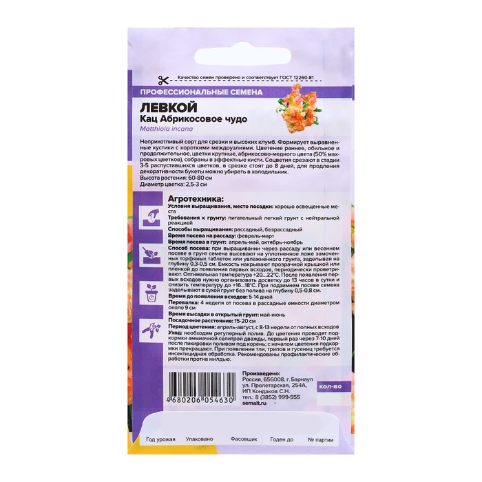 Габариты: 15 x 8 x 0,1 Страна: Россия В боксе: 1000 шт Состав: См. на упаковке Материалы: см. на упаковке Фасовка: по 10 шт Сертификат: Не подлежит сертификации Цвет: Оранжевый Вегетация: Многолетники Вид: Левкой Посев на рассаду: Февраль, Март Посев (посадка) в грунт: Май, Ноябрь, Октябрь, Апрель Цветение период: Июль, Июнь, Май, Август Место выращивания: Открытый грунт Сухоцвет: Нет Махровые: Нет Высота растений: 60-100 см По форме куста: Кустовая Назначение: Для создания цветников, клумбы Отношение к свету: Светолюбивые Разновидность: Цветущее Нуждаются ли в стратификации: Нет Неприхотливый сорт для срезки и высоких клумб. Формирует выравненные кустики с короткими междоузлиями. Цветение раннее, обильное и продолжительное, цветки крупные, абрикосово-медного цвета (50% махровых цветков), собраны в эффектные кисти. Соцветия срезают в стадии 3-5 распустившихся цветков, в срезке стоят до 8 дней, для продления декоративности букеты можно убирать в холодильник. Высота растения: 60-80 см Диаметр цветка: 2,5-3 см Условия выращивания, место посадки: хорошо освещенные места Требования к грунту: питательный легкий грунт с нейтральной реакцией Способы выращивания: рассадный, безрассадный Время посева на рассаду: февраль-март Время посева в грунт: апрель-май, октябрь-ноябрь. Комментарии к товару