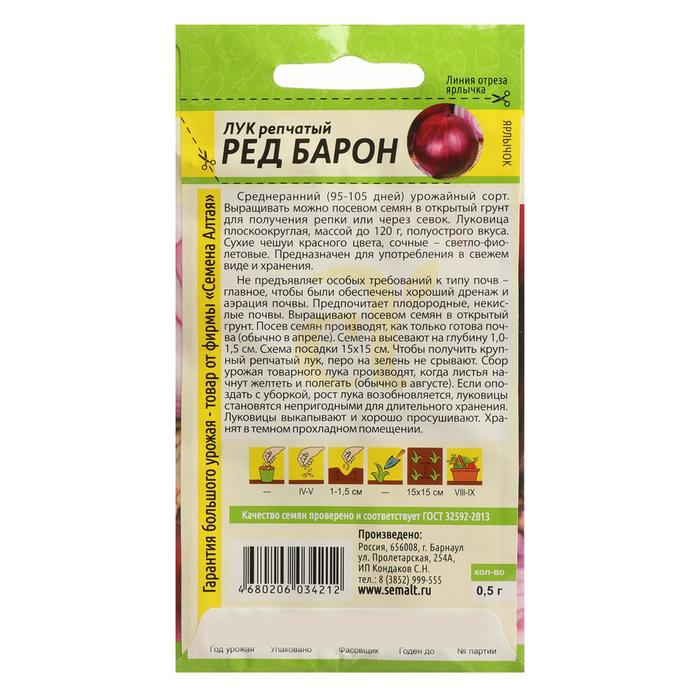 Габариты: 15 x 8 x 0,1 Страна: Россия В боксе: 600 шт Состав: См. на упаковке Материалы: см. на упаковке Фасовка: по 10 шт Индивидуальная упаковка: Без упаковки Сертификат: Не подлежит сертификации Сроки созревания: Среднеранний Место выращивания: Открытый грунт Сорт или гибрид: Сорт Вид лука: Репчатый Среднеранний (95-105 дней) урожайный сорт. Выращивать можно посевом семян в открытый грунт для получения репки или через севок. Луковица плоскоокруглая, массой до 120 г, полуострого вкуса. Сухие чешуи красного цвета, сочные – светло-фиолетовые. Предназначен для употребления в свежем виде и хранения. Не предъявляет особых требований к типу почв — главное, чтобы были обеспечены хороший дренаж и аэрация почвы. Предпочитает плодородные, некислые почвы. Выращивают посевом семян в открытый грунт. Посев семян производят, как только готова почва (обычно в апреле). Семена высевают на глубину 1,0-1,5 см. Схема посадки 15х15 см. Чтобы получить крупный репчатый лук, перо на зелень не срывают. Сбор урожая товарного лука производят, когда листья начнут желтеть и полегать (обычно в августе). Если опоздать с уборкой, рост лука возобновляется, луковицы становятся непригодными для длительного хранения. Луковицы выкапывают и хорошо просушивают. Хранят в темном прохладном помещении. Комментарии к товару