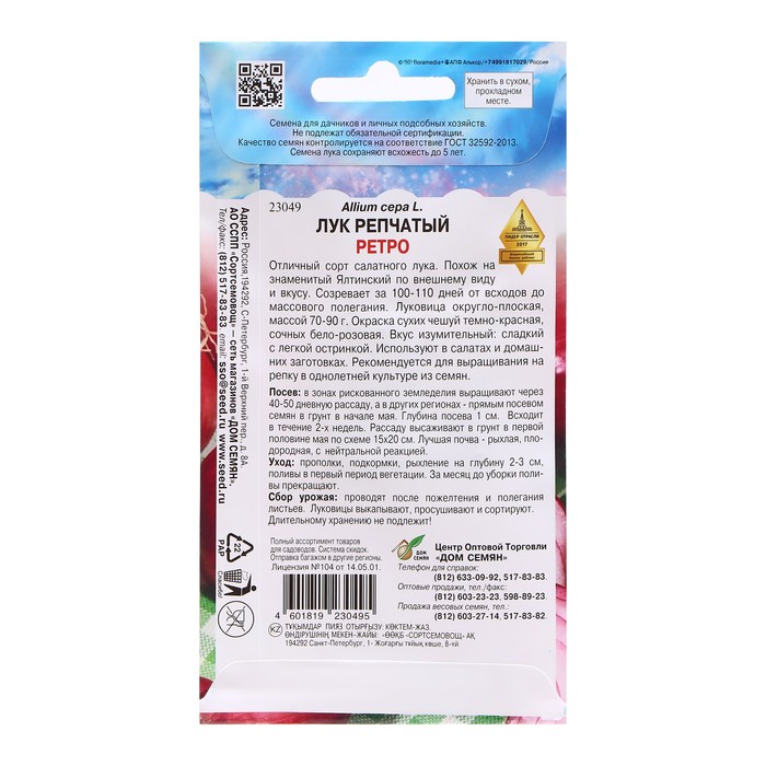 Габариты: 15 x 8 x 0,3 Страна: Россия В боксе: 300 шт Состав: См. на упаковке Материалы: см. на упаковке Фасовка: по 2 шт Индивидуальная упаковка: Без упаковки Сертификат: Не подлежит сертификации Сроки созревания: Средний Посев на рассаду: Март, Апрель Посев (посадка) в грунт: Май Место выращивания: Открытый грунт Сорт или гибрид: Сорт Вид лука: Репчатый Высокоурожайный среднеспелый, период от всходов до спелости 100-110 дней. Луковицы округлоплоской формы, массой 80-100 г. Окраска сухих чешуй темно-красная, сочных – красноватая. Шейка средней толщины, однозачатковый. Вкус сладкий. Рекомендуется для выращивания на репку в однолетней культуре из семян. Комментарии к товару