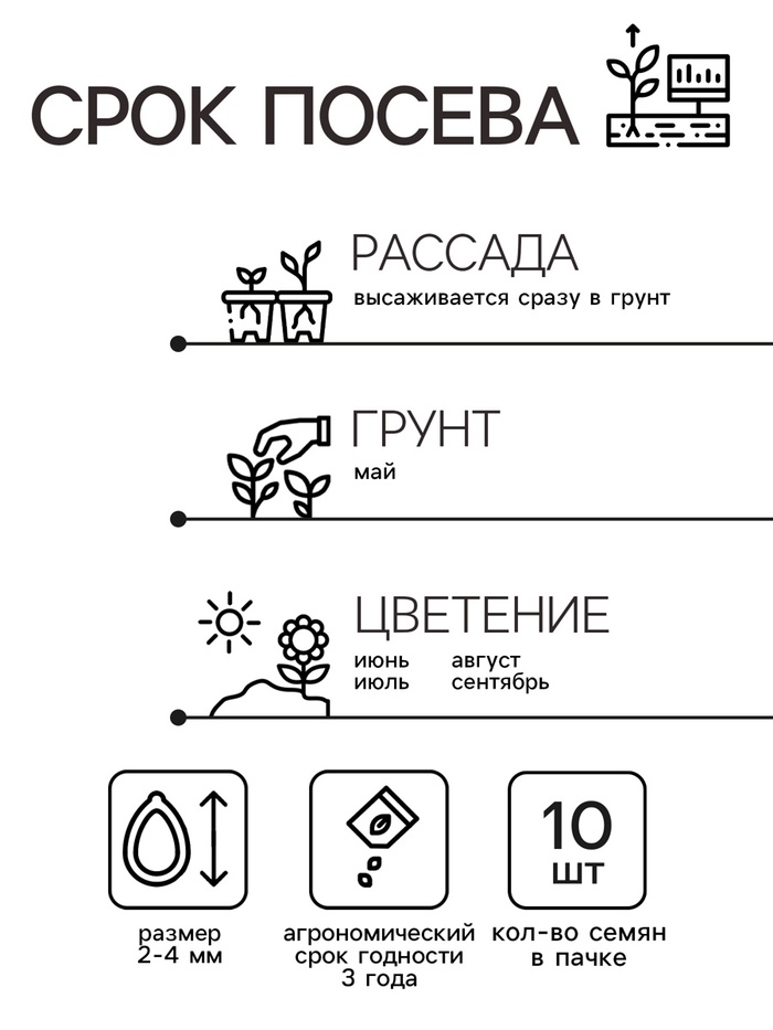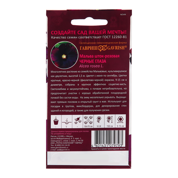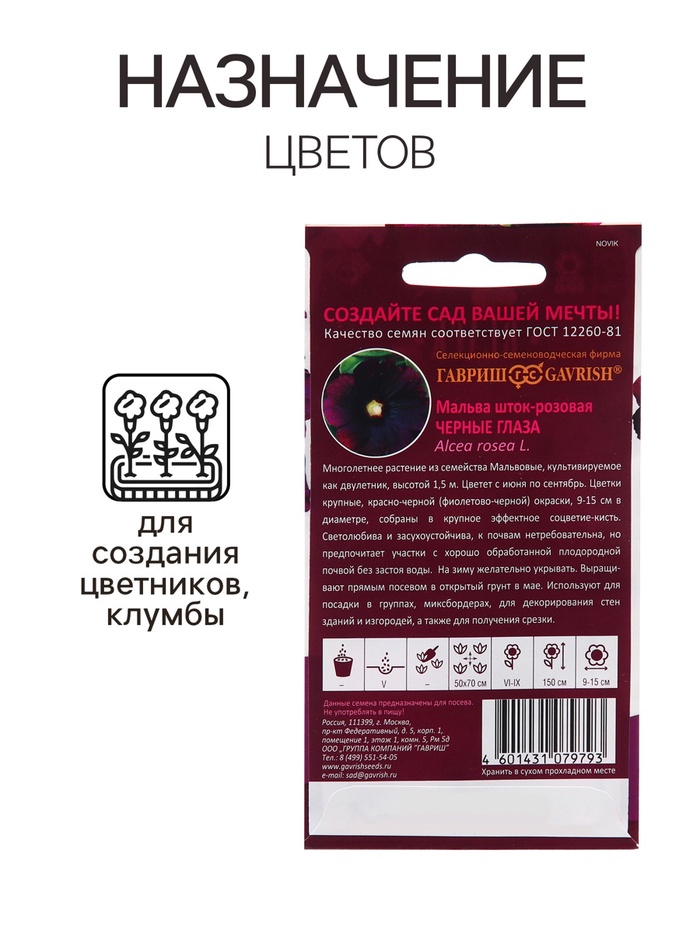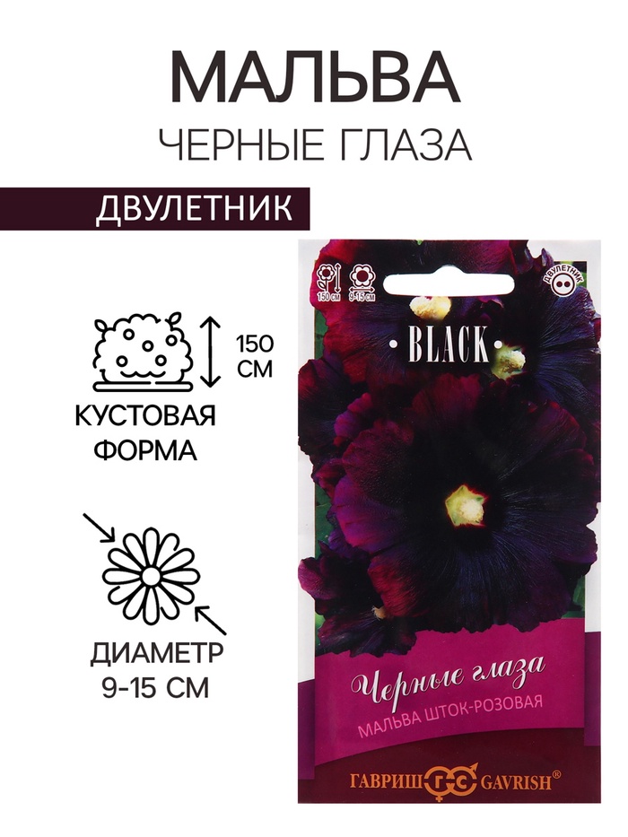 Габариты: 15 x 8 x 0,2 Страна: Россия В боксе: 100 шт Состав: Семена Материалы: семена Фасовка: по 10 шт Индивидуальная упаковка: Без упаковки Сертификат: Не подлежит сертификации Цвет: Бордовый Вегетация: Многолетники Вид: Шток-роза (Мальва) Место выращивания: Открытый грунт Сухоцвет: Нет Махровые: Да По форме куста: Кустовая, Лиана (вьющиеся) Назначение: Для создания цветников, клумбы Отношение к свету: Светолюбивые Разновидность: Цветущее Нуждаются ли в стратификации: Нет МАЛЬВА ЧЕРНЫЕ ГЛАЗА Многолетнее растение из семейства Мальвовых, культивируемое как двулетник, высотой 1,5 м. Цветет с июня по сентябрь. Цветки крупные, красно-черной (фиолетово-черной) окраски, 9-15 см в диаметре, собраны в крупное эффектное соцветие-кисть. Светолюбива и засухоустойчива, к почвам нетребовательна, но предпочитает участки с хорошо обработанной плодородной почвой без застоя воды. На зиму желательно укрывать. Выращивают прямым посевом в открытый грунт в мае. Используется для посадки в группах, миксбордерах, для декорирования стен зданий и изгородей, а также для получения срезки. Комментарии к товару