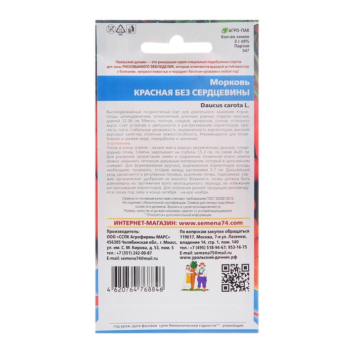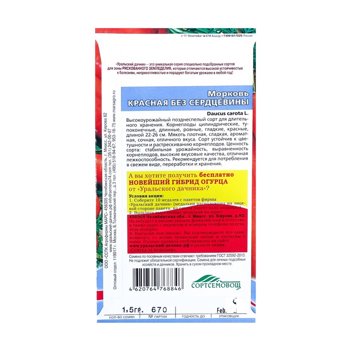 Габариты: 15 x 8 x 0,1 Страна: Россия В боксе: 400 шт Состав: Семена Материалы: семена Фасовка: по 9 шт Индивидуальная упаковка: Без упаковки Сертификат: Не подлежит сертификации Сроки созревания: Средний Посев (посадка) в грунт: Апрель Упаковка: Цветная Место выращивания: Открытый грунт Сорт или гибрид: Сорт Вегетационный период, дни: 90 Ампельные: Нет Вьющиеся (лианы): Нет Цвет плода: Оранжевый Вид: Простые семена Высокоурожайный позднеспелый сорт для длительного хранения. Корнеплоды цилиндрические, тупоконечные, длинные, ровные, гладкие, красные, длиной 22-26 см. Мякоть плотная, сладкая, ароматная, сочная, отличного вкуса. Сорт устойчив к цветушности и растрескиванию корнеплодов. Ценность сорта: стабильная урожайность, выравненность корнеплодов, высокие вкусовые качества, отличная лежкоспособность. Рекомендуется для потребления в свежем виде, переработки и хранения. Комментарии к товару