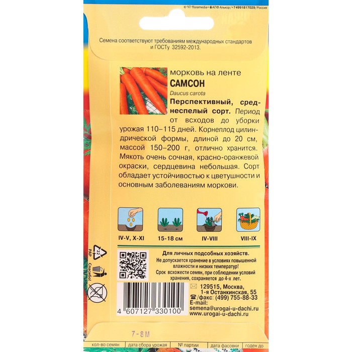Габариты: 15 x 8 x 1 Страна: Россия В боксе: 400 шт Состав: Семена Материалы: семена Фасовка: по 1 шт Индивидуальная упаковка: Без упаковки Сертификат: Не подлежит сертификации Сроки созревания: Средний Посев (посадка) в грунт: Июнь, Май, Апрель Место выращивания: Открытый грунт Сорт или гибрид: Сорт Цвет плода: Оранжевый Вид: На ленте Красивые сочные корнеплоды. Среднеспелый высокоурожайный сорт. Сортотип Нантская. Период от всходов до уборки урожая 110-112 дней. Корнеплоды цилиндрические, очень гладкие. Длина 20-22 см, масса 150-200 г. Поверхность красно-оранжевая. Мякоть отличного вкуса. Рекомендуется для потребления в свежем виде и хранения. Семена обработаны тирамом, не требуют замачивания. Комментарии к товару