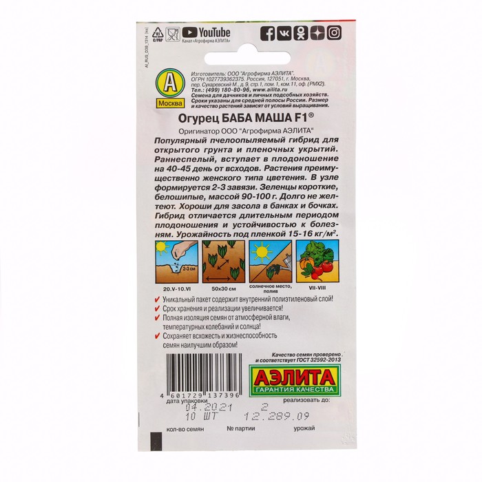 Раннеспелый пчелоопыляемый гибрид с длительным периодом плодоношения. От всходов до первого сбора плодов 38-40 дней. Растения преимущественно женского типа цветения, с частичной партенокарпией (часть плодов завязывается без опыления пчелами). В узле формируется 2-3 завязи. Зеленцы короткие (9-11 см) цилиндрические, мелкобугорчатые, белошипые, массой 90-100 г, без пустот. Вкус отличный, без горечи. Огурчики используют в свежем виде и для консервирования. Гибрид отличается высокой товарностью продукции и устойчивостью к болезням. Урожайность под пленкой – 15-16 кг/м2 .