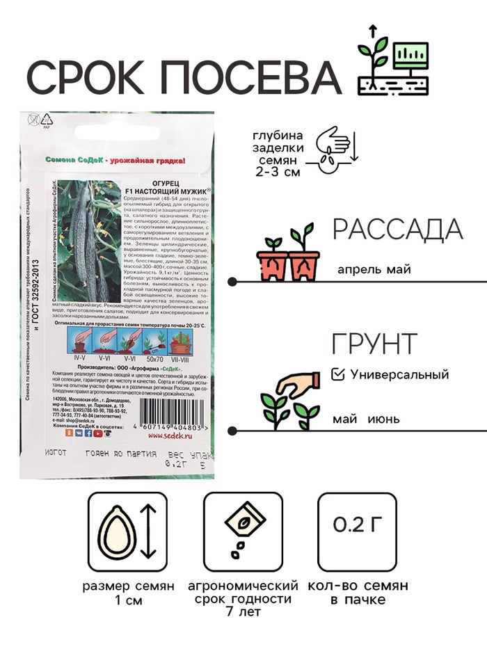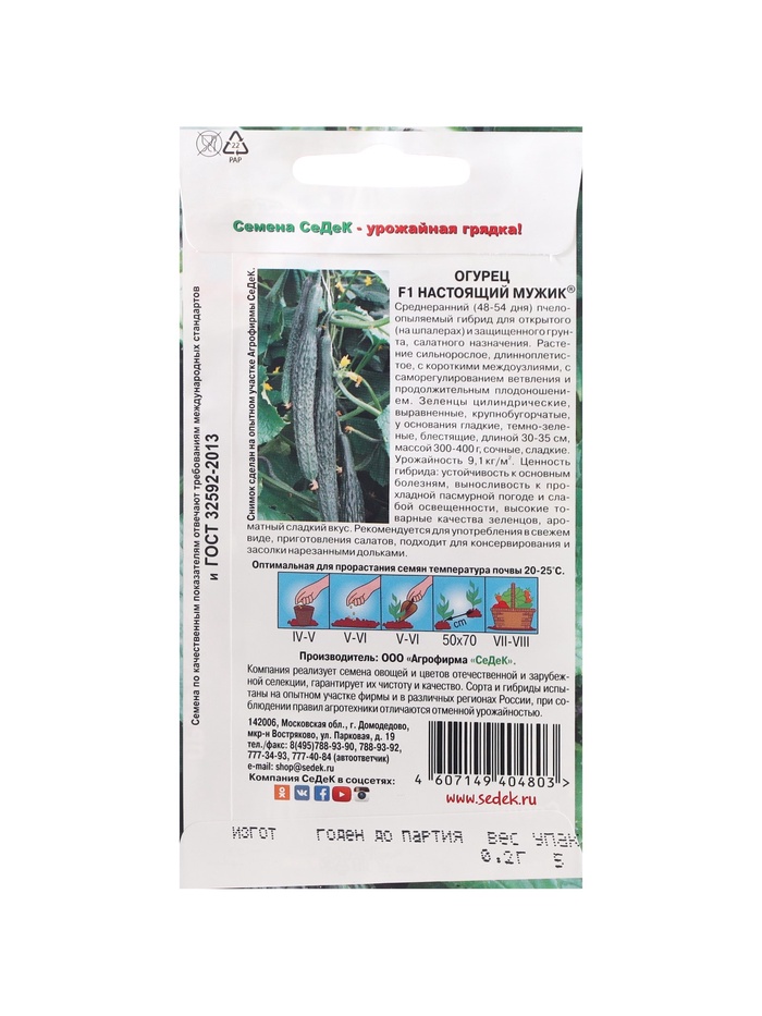 Габариты: 15 x 8 x 0,2 Страна: Россия В боксе: 1100 шт Состав: См. на упаковке Материалы: см. на упаковке Фасовка: по 10 шт Индивидуальная упаковка: Без упаковки Сертификат: Не подлежит сертификации Тип: Пчёлоопыляемый Сроки созревания: Средний Посев на рассаду: Май, Апрель Посев (посадка) в грунт: Май, Июнь Место выращивания: Универсальный Сорт или гибрид: Гибрид F1 Сорт: F1 Ампельные: Да Вьющиеся (лианы): Да Сроки созревания: Ранний ( до 48 дней) Размер: Крупноплодные (свыше 22 см) Форма: Удлиненно-цилиндрическая Применение: Универсальное Урожайность, м²: 9 - 9.01 Тип поверхности: Крупнобугорчатый Среднеранний (48-54 дня) пчелоопыляемый гибрид для открытого (на шпалерах) и защищенного грунта, Растение сильнорослое, длинноплетистое, с короткими междоузлиями, с саморегулированием ветвления и продолжительным плодоношением. Зеленцы цилиндрические, выравненные, крупнобугорчатые, у основания гладкие, темно-зеленые, блестящие, длиной 30-35 см, массой 300-400 г, сочные, сладкие. Гибрид устойчив к основным болезням, вынослив к прохладной пасмурной погоде и слабой освещенности, имеет высокие товарные качества зеленцов, ароматный сладкий вкус. Назначение салатное, подходит для консервирования и засолки нарезанными дольками. Урожайность 15-18 кг/м2. Комментарии к товару