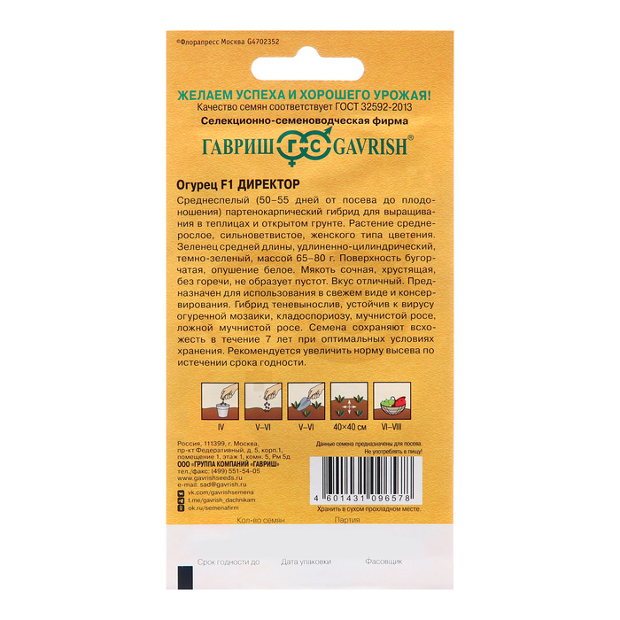 Гибрид раннеспелый, партенокарпический. В одном узле формируется по 2-3 плода. Плоды цилиндрические, крупнобугорчатые, тёмно-зелёные, длиной 9-10,5 см, диаметром 3-3,5 см, массой 65-80 г, без горечи, очень аппетитные.