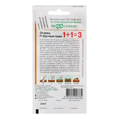 Габариты: 15 x 8 x 0,2 Страна: Россия В боксе: 600 шт Состав: Семена Материалы: семена Фасовка: по 10 шт Индивидуальная упаковка: Без упаковки Сертификат: Не подлежит сертификации Тип: Партенокарпические Сроки созревания: Ранний Место выращивания: Универсальный Сорт или гибрид: Гибрид F1 Сорт: F1 Ампельные: Да Вьющиеся (лианы): Да Сроки созревания: Ранний ( до 48 дней) Размер: Среднеплодные (от 18 до 22 см) Скороспелый (46-48 дней от всходов до плодоношения) партенокарпический гибрид с букетным расположением завязей (максимально 10-12 цветков в пазухе!). Предназначен для выращивания в открытом и защищенном грунте. Зеленец длиной 10-11 см, массой 90-100 г, частобугорчатый, белошипый, без горечи. Плоды темно-зеленой окраски со светлыми полосами. Использование плодов универсальное. Гибрид отличается ранним, обильным и продолжительным плодоношением. Урожайность одного растения 5,4-7,2 кг. Посев на рассаду — в конце апреля. Высадка рассады в грунт — в конце мая – начале июня. Высадка рассады производится в фазе 3-4-х настоящих листьев. Посев непосредственно в теплицу — в середине мая. Схема посадки: 50х50 см. Комментарии к товару