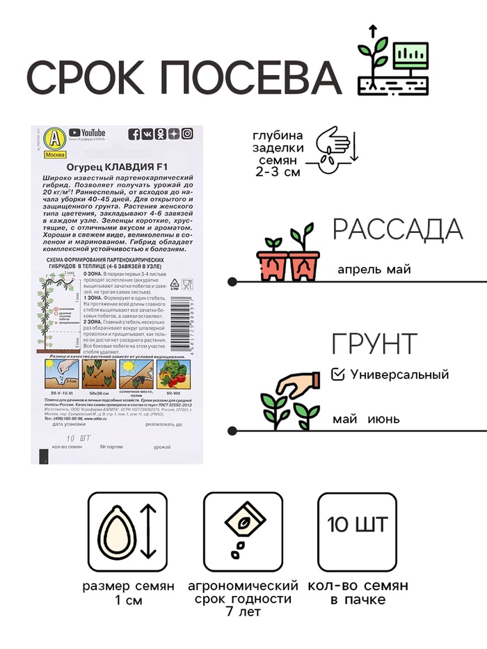 Скороспелый партенокарпический гибрид «Клавдия» образует множество цилиндрических бугорчатых огурцов длиной 10–12 см и массой 65–80 г. Сорт отличается стабильной урожайностью, дружной отдачей и комплексной устойчивостью к болезням.