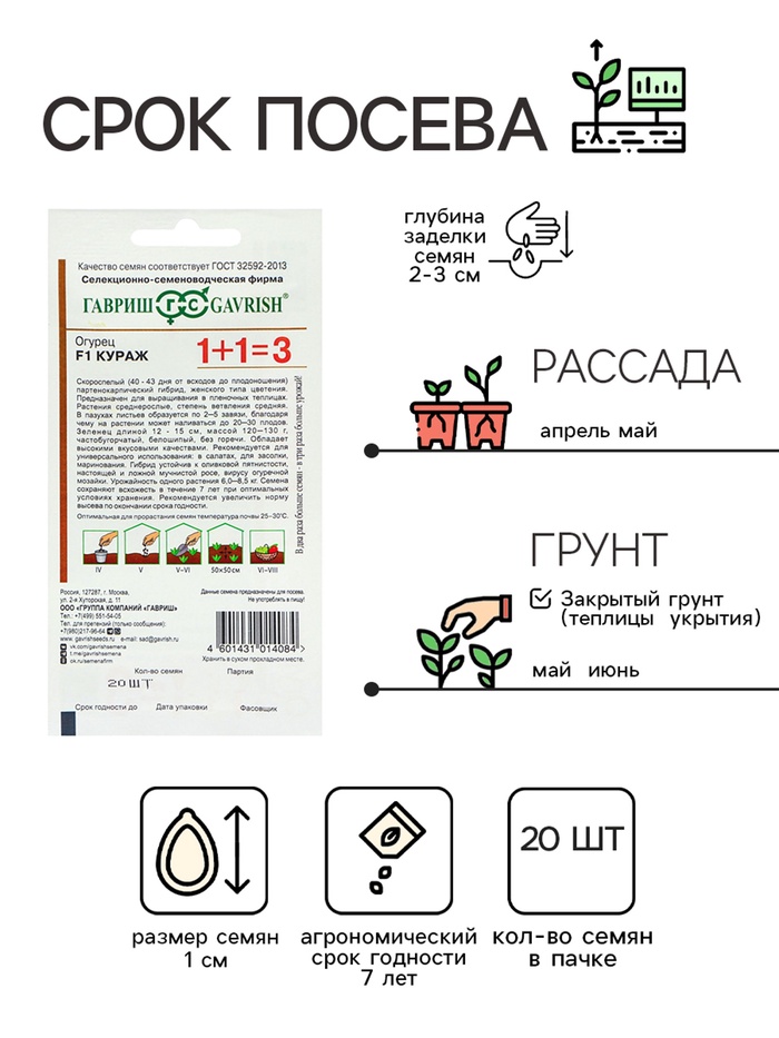 Скороспелый партенокарпический гибрид (от всходов до плодоношения 45-50 дней), женского типа цветения, предназначен для выращивания в пленочных теплицах. Растения сильнорослые, побегообразовательная способность средняя. В узлах образуется по 2-4 завязи (до 5-6 штук). Зеленец темно-зеленый со светлыми полосами, длиной 12-15 см, массой 120-130 г, бугорчатый, белошипый, универсального использования. Вкусовые качества высокие, без горечи. Плотность посадки 2,5-3,0 растения/м2. Относительно устойчив к основным заболеваниям огурца. Урожайность 6,0-8,0 кг/растение.