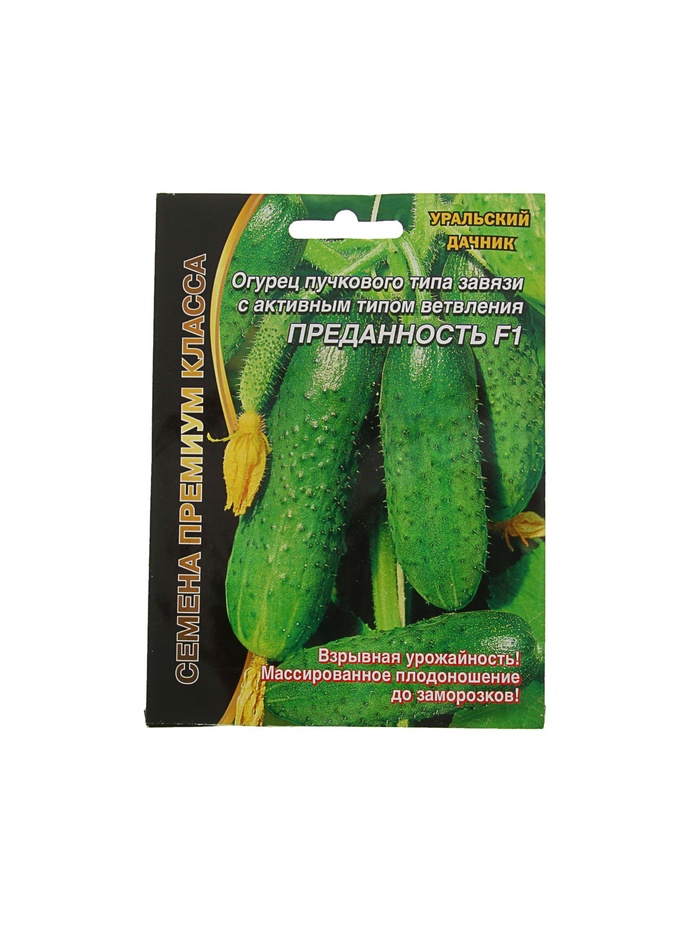 Высокоурожайный среднеранний гибрид женского типа цветения «Преданность» предназначен для открытого и защищённого грунта. Характерная особенность сорта — интенсивный рост основной плети и быстрое появление боковых побегов, с которыми наступает пик массового плодоношения.