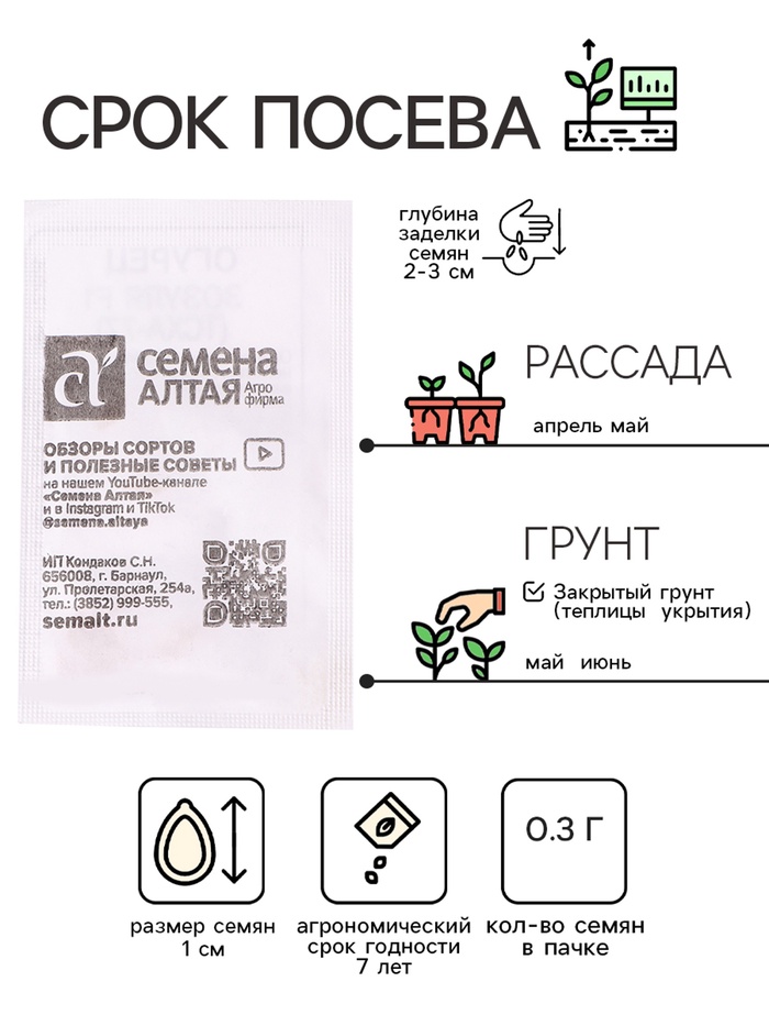 Габариты: 11,5 x 7,5 x 0,1 Страна: Россия В боксе: 800 шт Состав: См. на упаковке Материалы: см. на упаковке Фасовка: по 20 шт Индивидуальная упаковка: Без упаковки Сертификат: Не подлежит сертификации Тип: Партенокарпические Сроки созревания: Ранний Место выращивания: Закрытый грунт (теплицы, укрытия) Сорт или гибрид: Гибрид F1 Сорт: F1 Ампельные: Да Вьющиеся (лианы): Да Сроки созревания: Ранний ( до 48 дней) Размер: Среднеплодные (от 18 до 22 см) Один из самых популярных раннеспелых гибридов для выращивания в защищенном грунте. Зеленец цилиндрический, слабо-бугорчатый, длиной 14-22 см, массой 160-290 г. Урожайность 17-30 кг/кв.м. Обладает частичной партенокарпией (способен завязывать плоды без опыления). Плоды пригодны для засолки, не желтеют, долго сохраняют товарный вид. Выращивают прямым посевом семян в грунт и рассадным способом. Семена в открытый грунт высевают, когда почва прогреется до 15-20°С днем и не ниже 8°С ночью. Бороздки или лунки, заполненные субстратом из торфа, навозного перегноя, песка и минеральных удобрений, поливают, заделывают в них семена на глубину 1,5-2,0 см, мульчируют торфом или перепревшим навозом и накрывают пленкой. В остекленные или пленочные теплицы, тоннели с начала мая высевают семена или с середины мая высаживают 20-25-дневную рассаду, имеющую 3-5 настоящих листьев. Схема посадки 70х40. Не требует формировки. Комментарии к товару