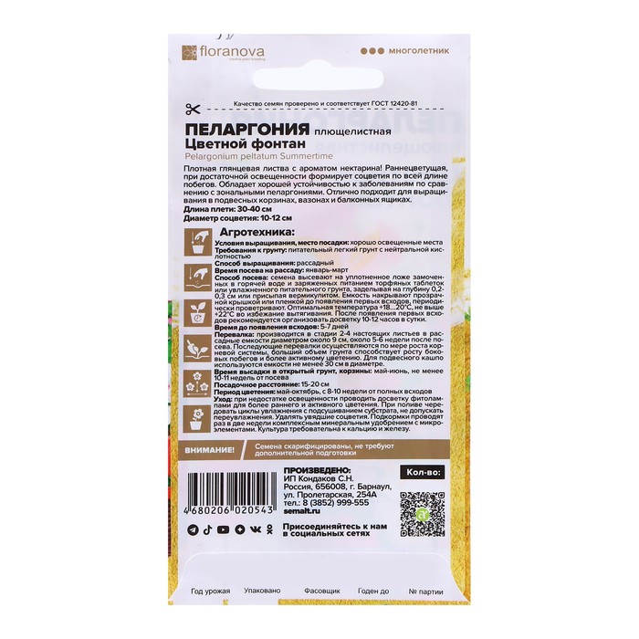 Габариты: 15 x 8 x 0,1 Страна: Россия В боксе: 90 шт Состав: См. на упаковке Материалы: см. на упаковке Фасовка: по 10 шт Сертификат: Не подлежит сертификации Цвет: МИКС Вегетация: Однолетники Вид: Пеларгония Место выращивания: Открытый грунт Подходит для балкона: Да Сухоцвет: Нет Махровые: Нет По форме куста: Ампельная Назначение: Для балкона, веранды Отношение к свету: Рассеянный свет Разновидность: Цветущее Роскошная каскадная пеларгония, выращиваемая из семян. Низкорослые растения, высотой до 10 см, образуют множество сильноветвящихся побегов длиной до 40 см с яркими соцветиями различной окраски. Побеги достаточно крепкие, способные по мере роста цепляться за уступы каменистых склонов и карабкаться вверх. Используется для вертикального озеленения, прекрасно смотрится в контейнерах и кашпо. Высаженная в балконный ящик, вазон, на клумбу возле дома, пеларгония демонстрирует великолепное цветение в тёплый период года. Одно из самых неприхотливых растений, уход за которым не требует значительных усилий. Пеларгония светолюбива, легко переносит недостаток влаги. Предпочитает влагоёмкую рыхлую питательную почву с чуть кислой или нейтральной реакцией. Семена на рассаду высевают с января по сентябрь. Глубина заделки – 0,5-1,0 см. Для получения наилучшего результата посев рекомендуем проводить в торфяные таблетки (одно семя в таблетку). Посевы накрывают пленкой или стеклом и ставят в светлое теплое место. При температуре +20-21°С всходы появляются на 7-14 день. В период короткого светового дня им требуется досвечивание фитолампой, при недостаточном освещении они могут вытянуться. В фазе 2-3-х настоящих листьев сеянцы пикируют в отдельные горшки, обеспечив дренаж. В сад растения можно высаживать с конца мая, когда минует угроза заморозков. Посадочный интервал – 30-40 см. Для увеличения количества побегов и лучшего кущения в фазе 4-5 пар листьев проводят формирующую прищипку. В теплое время года растениям необходим обильный полив, зимой поливают умеренно. Для обильного и продолжительного цветения необходимо своевременно удалять увядающие соцветия и листья, после цветения проводить подкормку комплексными минеральными удобрениями, а также микроудобрениями, особенно важны магний и йод. Комментарии к товару