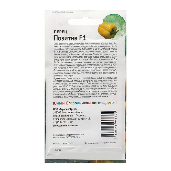 Габариты: 15 x 8 x 0,1 Страна: Россия В боксе: 200 шт Состав: См. на упаковке Материалы: см. на упаковке Фасовка: по 10 шт Индивидуальная упаковка: Без упаковки Сертификат: Не подлежит сертификации Цвет: Жёлтый Сроки созревания: Ранний Вкус: Сладкий Место выращивания: Закрытый грунт (теплицы, укрытия) Сорт или гибрид: Гибрид F1 Среднеранний гибрид, от всходов до плодоношения 100-110 дней. Растения хорошо облиственные, полураскидистое, сильнорослые. Плоды кубовидные, 10-12 см длиной, диаметром 8-10 см, толщина стенки 8-10 мм, массой 160-200 г. Окраска плодов в технической спелости темно-зеленая, в биологической желтая. Плоды отличного вкуса и ярко выраженного «перченого» аромата. Гибрид отличается одновременным завязыванием и наливом большого количества плодов. Плоды выравненные, плотные, прочные, прекрасно транспортируются. Гибрид прекрасно переноси неблагоприятные погодные условия, устойчив к вирусу табачной мозаики и фузаритарному увяданию. Отличается высокой урожайностью, длительным плодоношением и высокой товарностью плодов. Рекомендуется для выращивания в пленочных теплицах. Агротехника: перец сладкий – теплолюбивая культура, требующая плодородных, хорошо дренируемых почв. На рассаду семена высеивают в середине февраля – начале марта. Оптимальная температура прорастания 20-25 С. Всходы появляются через 12-15 дней, пикируют сеянцы в фазе 1-2-го листа. За 7-14 дней перед высадкой рассады на постоянное место рекомендуется проводить закаливание растений. Схема посадки 70*40 см. Растение формируют в 1 стебель. Уход заключается в поливе, рыхлении и своевременных подкормках. Комментарии к товару