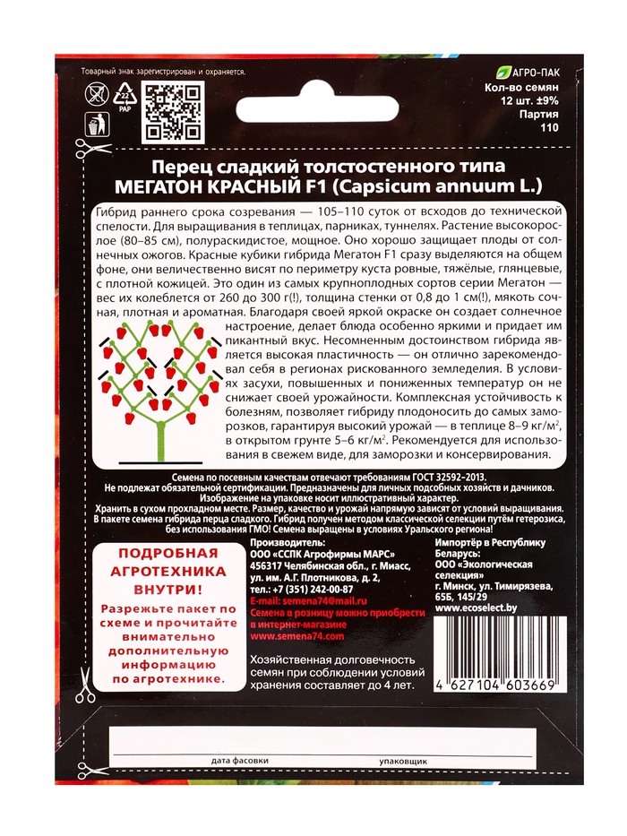 Посев на рассаду в конце февраля – начале марта, пикировка в фазе одного настоящего листа. Рассаду рекомендуется выращивать в течение 60 дней от всходов и высаживать в фазе бутонизации. До определенного момента перец растет в один стебель, но при достижении высоты 15-20 см начинает разветвляться, образуя несколько ветвей. На месте разветвления формируется первый цветочный бутон, который овощеводы называют коронным. Его для лучшего ветвления и развития куста следует удалить. В теплицу высаживают в середине мая, а в открытый грунт — в середине июня, после окончания весенних заморозков, по схеме 60х60 см. Высокорослые сорта выращивают на шпалере, с формировкой в 2 стебля. Культура теплолюбива, требовательна к плодородию и влажности почвы.