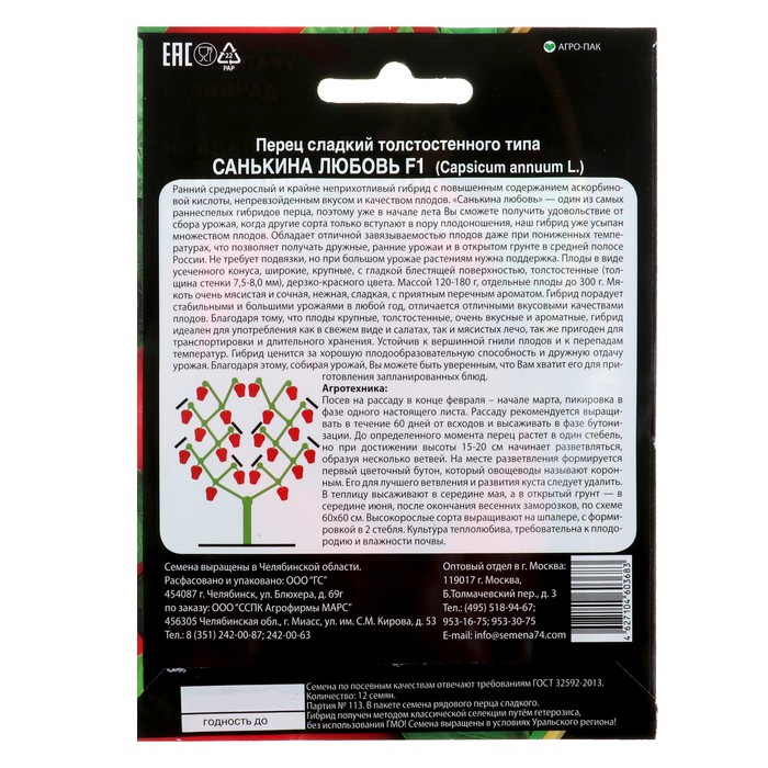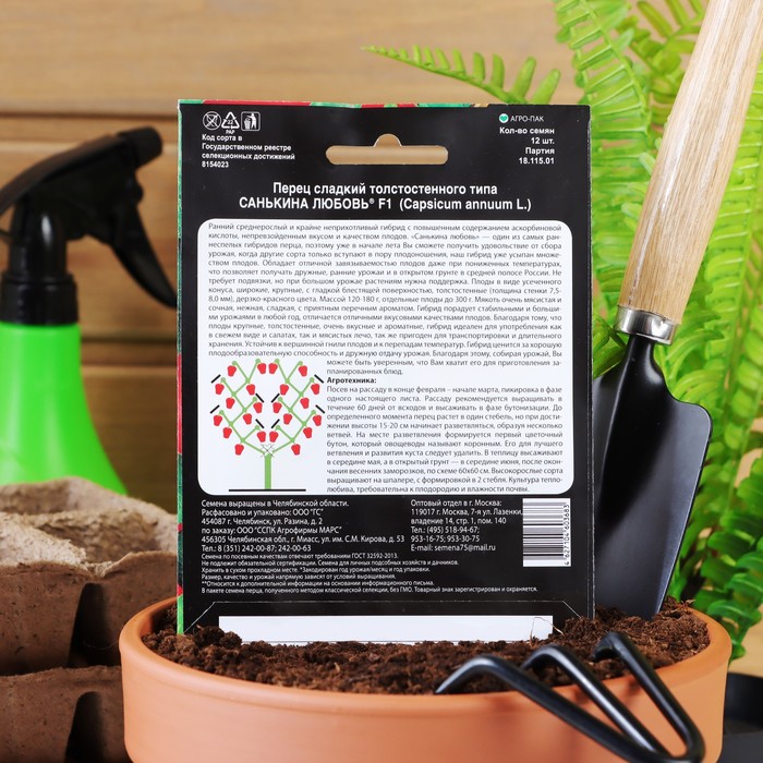 Габариты: 15 x 11 x 0,2 Страна: Россия В боксе: 700 шт Состав: Семена Материалы: семена Фасовка: по 10 шт Индивидуальная упаковка: Без упаковки Сертификат: Не подлежит сертификации Цвет: Красный Сроки созревания: Ранний Вкус: Сладкий Посев на рассаду: Февраль, Март Посев (посадка) в грунт: Май Упаковка: Цветная Место выращивания: Универсальный Сорт или гибрид: Гибрид F1 Вегетационный период, дни: 100 Толстостенный тип: Да Высота: Среднерослые (50-70 см) Вес: Среднеплодные (от 100 до 200 г) Ранний среднерослый и крайне неприхотливый гибрид с повышенным содержанием аскорбиновой кислоты, непревзойденным вкусом и качеством плодов. «Санькина любовь» — один из самых раннеспелых гибридов перца, поэтому уже в начале лета Вы сможете получить удовольствие от сбора урожая, когда другие сорта только вступают в пору плодоношения, наш гибрид уже усыпан множеством плодов. Обладает отличной завязываемостью плодов даже при пониженных температурах, что позволяет получать дружные, ранние урожаи и в открытом грунте в средней полосе России. Не требует подвязки, но при большом урожае растениям нужна поддержка. Плоды в виде усеченного конуса, широкие, крупные, с гладкой блестящей поверхностью, толстостенные (толщина стенки 7,5-8,0 мм), дерзко-красного цвета. Массой 120-180 г, отдельные плоды до 300 г. Мякоть очень мясистая и сочная, нежная, сладкая, с приятным перечным ароматом. Гибрид порадует стабильными и большими урожаями в любой год, отличается отличными вкусовыми качествами плодов. Благодаря тому, что плоды крупные, толстостенные, очень вкусные и ароматные, гибрид идеален для употребления как в свежем виде и салатах, так и мясистых лечо, так же пригоден для транспортировки и длительного хранения. Устойчив к вершинной гнили плодов и к перепадам температур. Гибрид ценится за хорошую плодообразовательную способность и дружную отдачу урожая. Благодаря этому, собирая урожай, Вы можете быть уверенным, что Вам хватит его для приготовления запланированных блюд. Посев на рассаду в конце февраля – начале марта, пикировка в фазе одного настоящего листа. Рассаду рекомендуется выращивать в течение 60 дней от всходов и высаживать в фазе бутонизации. До определенного момента перец растет в один стебель, но при достижении высоты 15-20 см начинает разветвляться, образуя несколько ветвей. На месте разветвления формируется первый цветочный бутон, который овощеводы называют коронным. Его для лучшего ветвления и развития куста следует удалить. В теплицу высаживают в середине мая, а в открытый грунт — в середине июня, после окончания весенних заморозков, по схеме 60х60 см. Высокорослые сорта выращивают на шпалере, с формировкой в 2 стебля. Культура теплолюбива, требовательна к плодородию и влажности почвы. Комментарии к товару