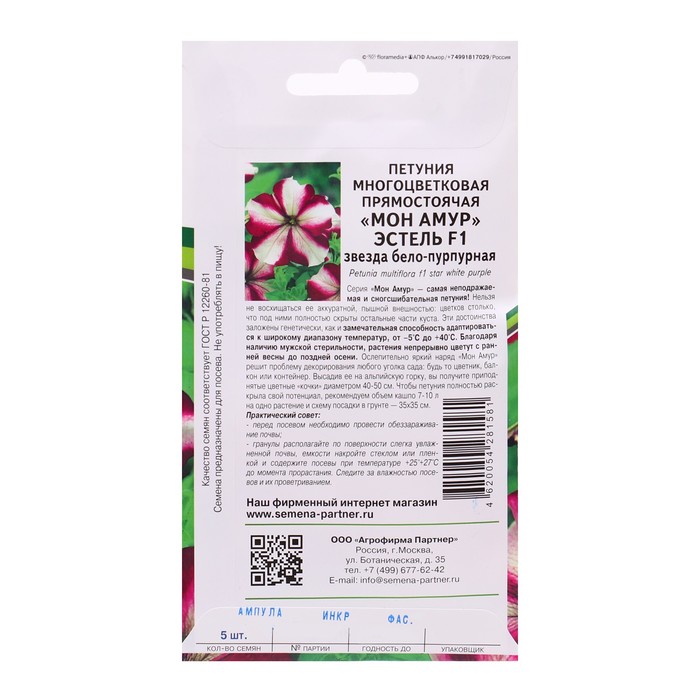 Габариты: 15 x 8 x 0,5 Страна: Россия В боксе: 100 шт Состав: См. на упаковке Материалы: см. на упаковке Фасовка: по 10 шт Сертификат: Не подлежит сертификации Цвет: Бордовый, Белый Вегетация: Однолетники Вид: Петуния Место выращивания: Открытый грунт Сухоцвет: Нет Махровые: Нет По форме куста: Кустовая Назначение: Для создания цветников, клумбы Самая неподражаемая и сногсшибательная петуния. Нельзя не восхищаться ее аккуратной, пышной внешностью: цветков столько, что под ними полностью скрыты остальные части куста. Эти достоинства заложены генетически, как и замечательная способность адаптироваться к широкому диапазону температур, от –5°С до +40°С. Благодаря наличию мужской стерильности, растения непрерывно цветут с ранней весны до поздней осени. Ослепительно яркий наряд «Мон Амур» решит проблему декорирования любого уголка сада: будь то цветник, балкон или контейнер. Высадив ее на альпийскую горку, вы получите приподнятые цветные «кочки» диаметром 40-50 см. Чтобы петуния полностью раскрыла свой потенциал, рекомендуем объем кашпо 7-10 л на одно растение и схему посадки в грунте – 35х35 см. Комментарии к товару