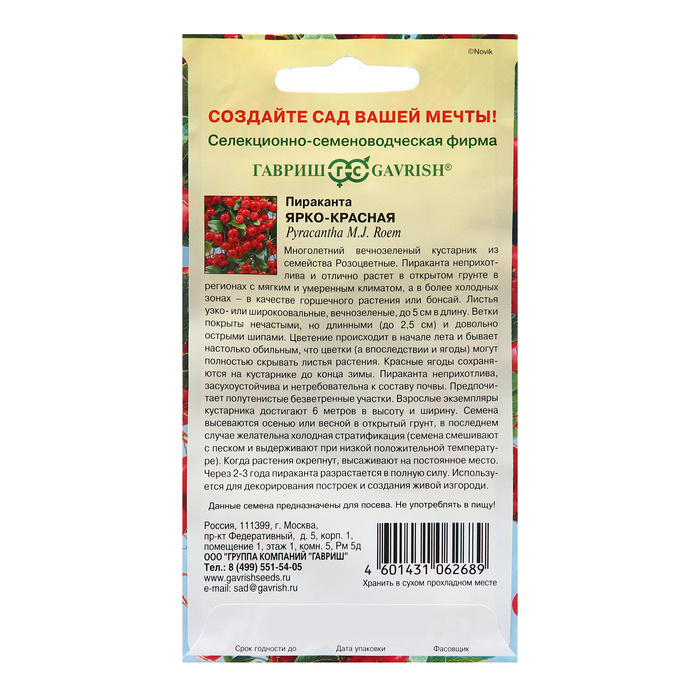 Габариты: 15 x 8 x 0,3 Страна: Россия В боксе: 200 шт Состав: Семена Материалы: семена Фасовка: по 10 шт Индивидуальная упаковка: Без упаковки Сертификат: Не подлежит сертификации Цвет: Красный Высота, см: 1 - 6 Вегетация: Однолетники Посев (посадка) в грунт: Октябрь, Апрель, Сентябрь, Май Цветение период: Июль, Июнь Место выращивания: Открытый грунт Подходит для балкона: Да Сухоцвет: Нет Махровые: Нет Высота растений: Выше 200 см По форме куста: Кустовая, Ампельная Назначение: Для создания цветников, клумбы Отношение к свету: Светолюбивые Разновидность: Цветущее Нуждаются ли в стратификации: Нет Семена Пираканта Ярко-красная. Многолетний вечнозеленый кустарник из семейства Розоцветные. Пираканта неприхотлива и отлично растет в открытом грунте в регионах с мягким и умеренным климатом, а в более холодных зонах – в качестве горшечного растения или бонсай. Листья узко- или широкоовальные, вечнозеленые, до 5 см. в длину. Ветки покрыты нечастыми, но длинными (до 2,5 см.) и довольно острыми шипами. Цветение происходит в начале лета и бывает настолько обильным, что цветки (а впоследствии и ягоды) могут полностью скрывать листья растения. Красные ягоды сохраняются на кустарнике до конца зимы. Пираканта неприхотлива, засухоустойчива и не требовательна к составу почвы. Предпочитает полутенистые безветренные участки. Взрослые экземпляры кустарника достигают 6 метров в высоту и ширину. Семена высеваются осенью или весной в открытый грунт, в последнем случае желательна холодная стратификация (семена смешивают с песком и выдерживают при низкой положительной температуре). Кода растения окрепнут, высаживают на постоянное место. Через 2-3 года пираканта разрастаются в полную силу. Используется для декорирования построек и создания живой изгороди. Комментарии к товару